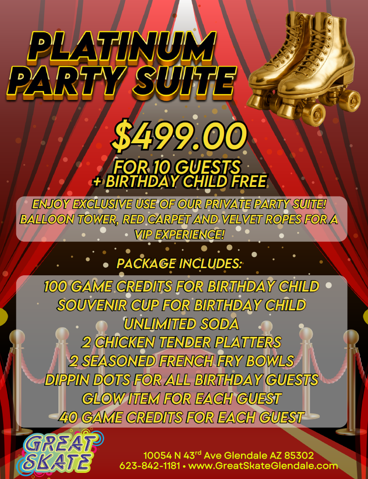 The world’s greatest kids skating birthday party destination is right in your neighborhood at Great Skate! Our Glendale skating rink is the best spot for birthday parties in Arizona! We know birthdays are special so we will give you an experience you’ll never forget. The best part is we do all the work so you can have all the fun!