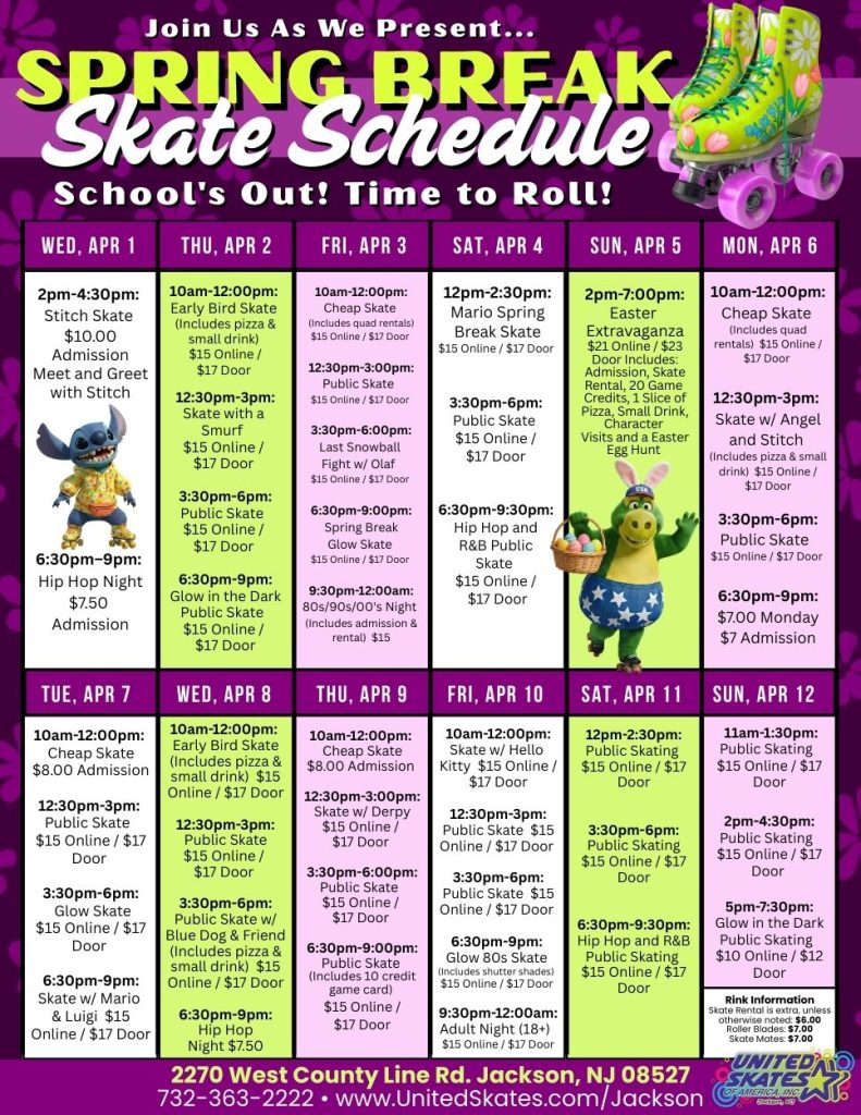 School’s out, and it’s time to lace up your skates and make unforgettable memories! Join us at United Skates of America – Jackson for our exciting Spring Break Skate Schedule, packed with themed events, family fun, character visits, glow parties, and special deals from April 1–12. Whether you’re planning a day out with the kids, a fun night with friends, or a family activity, we have something for everyone.