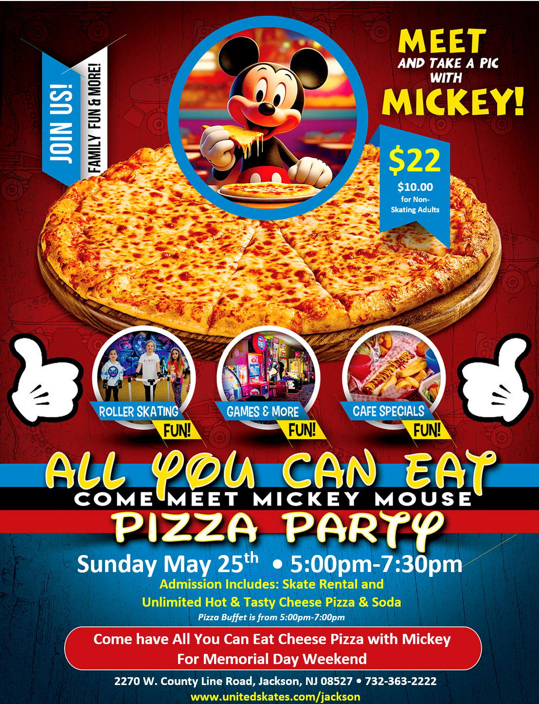 🎉 Bring the whole family and skate into the holiday weekend with Mickey, music, and mouthwatering pizza! You don’t want to miss it!