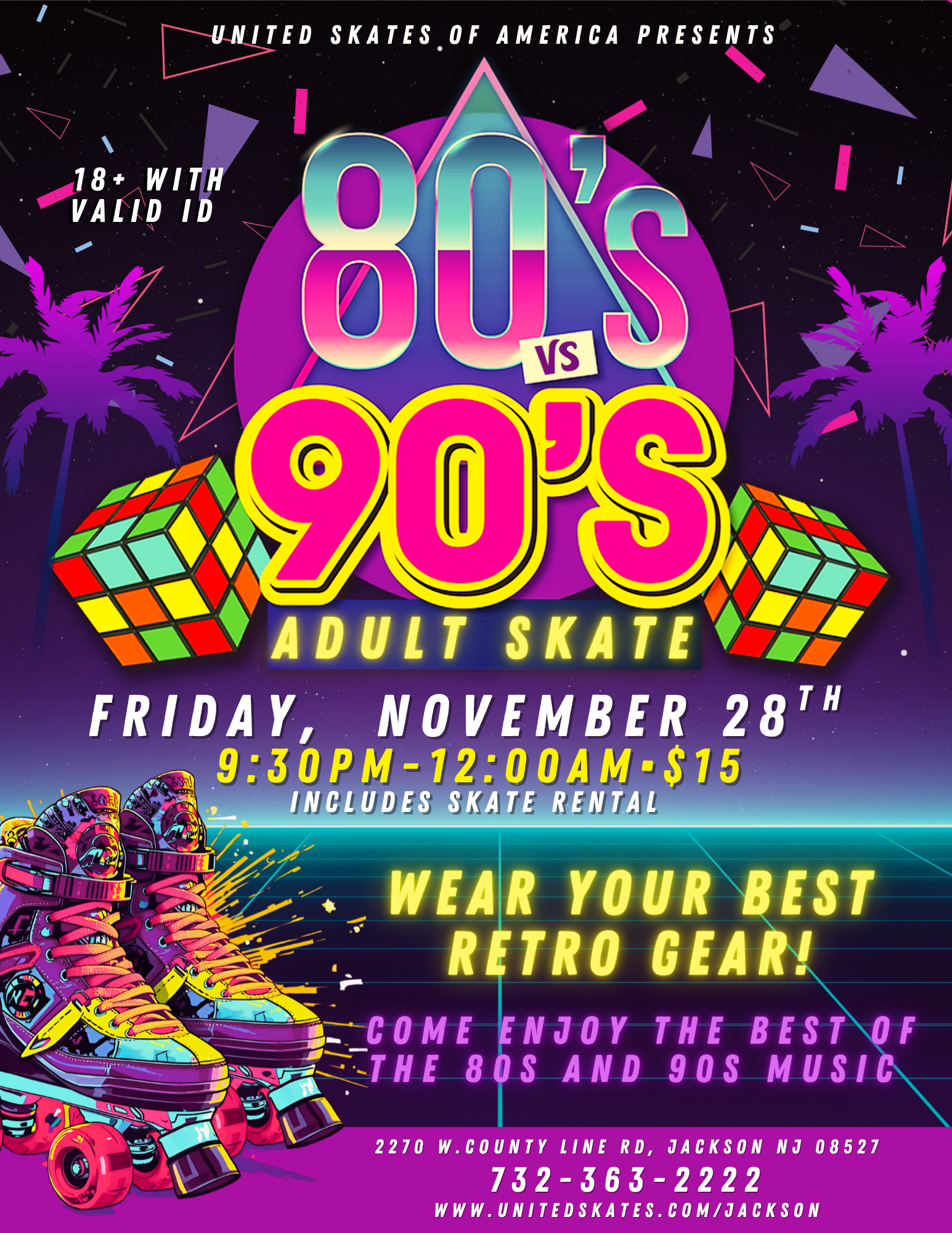 Join us for an unforgettable Adult Skate Night featuring the best hits from both decades, an electric atmosphere, and non-stop nostalgia.