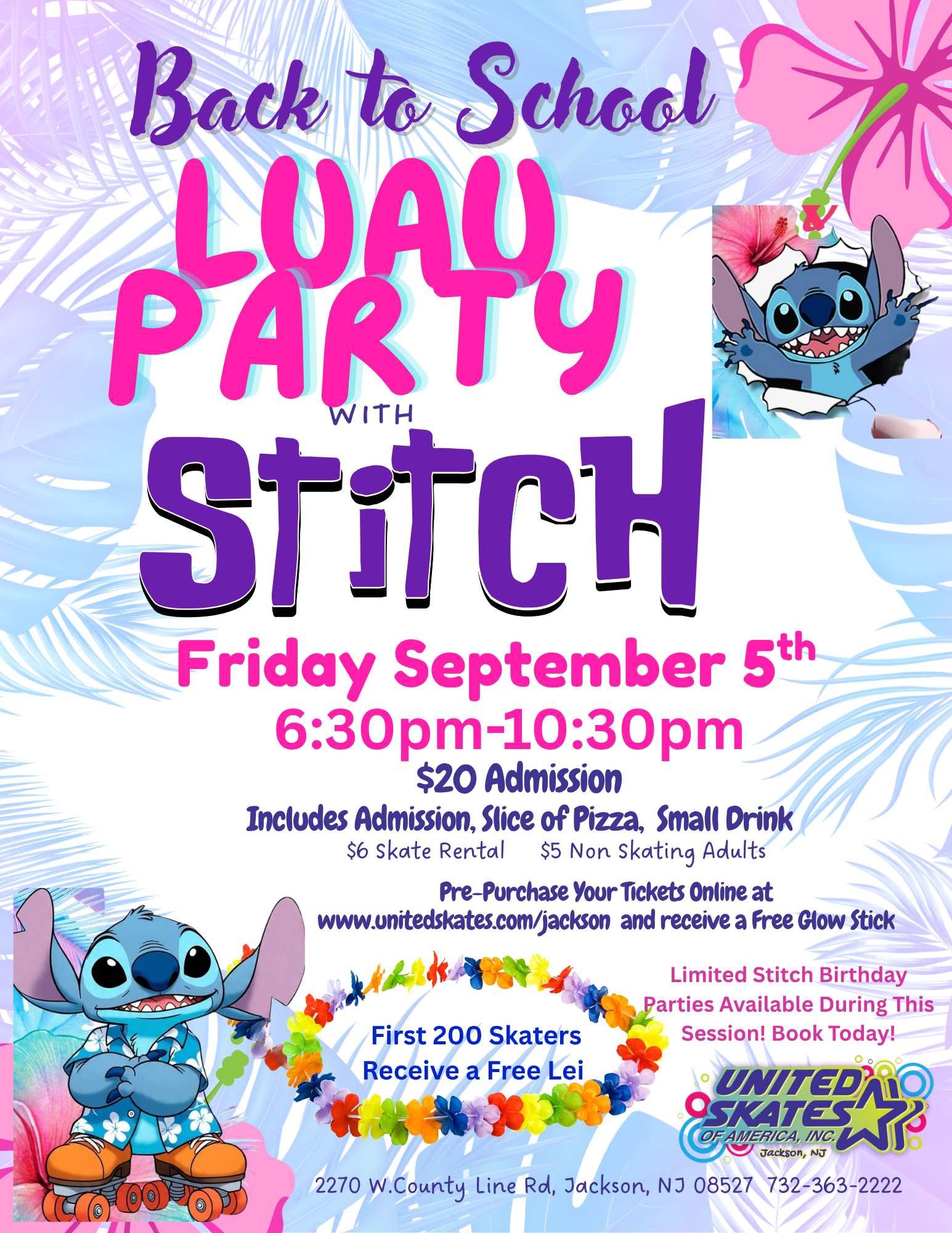 🌸 Aloha, skaters! 🌺 Kick off the school year in style with our Back to School Luau Party featuring a special appearance by Stitch!