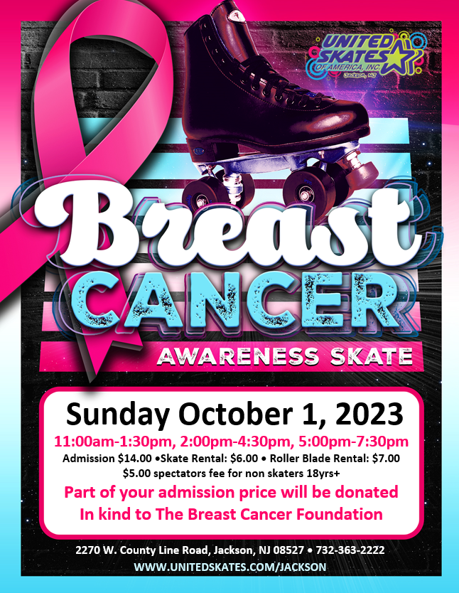 We are roller skating together for a cause and a % of your admission is donated to the American Breast Cancer Awareness Foundation!