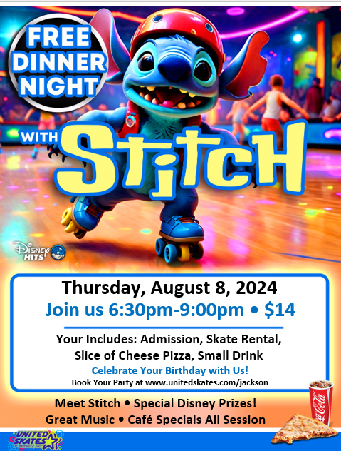 🌟 Join us for a magical evening at Free Dinner Night with Stitch on Thursday, August 8th from 6:30 PM to 9:00 PM! 🌟 For just $14, enjoy admission, skate rental, a slice of cheese pizza, a small drink, and a special visit from Stitch himself! Don’t miss out on this unforgettable night of fun and food! See you there! 🍕✨ #FreeDinnerNight #Stitch #FamilyFun
