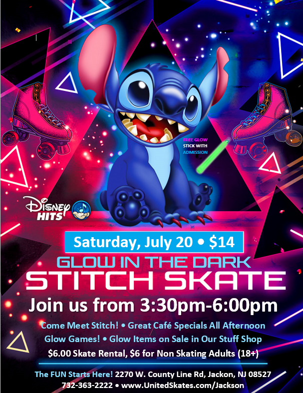 🌟✨ Get ready to glow with Stitch at our Glow in the Dark Skate on July 20th from 3:30 PM to 6:00 PM! 🌌🛹