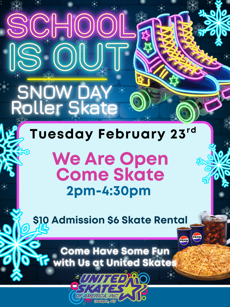 Looking for something fun to do on your snow day? We’ve got you covered! Join us for our Snow Day Roller Skate session this Tuesday, February 23rd at United Skates of America in Jackson, NJ.