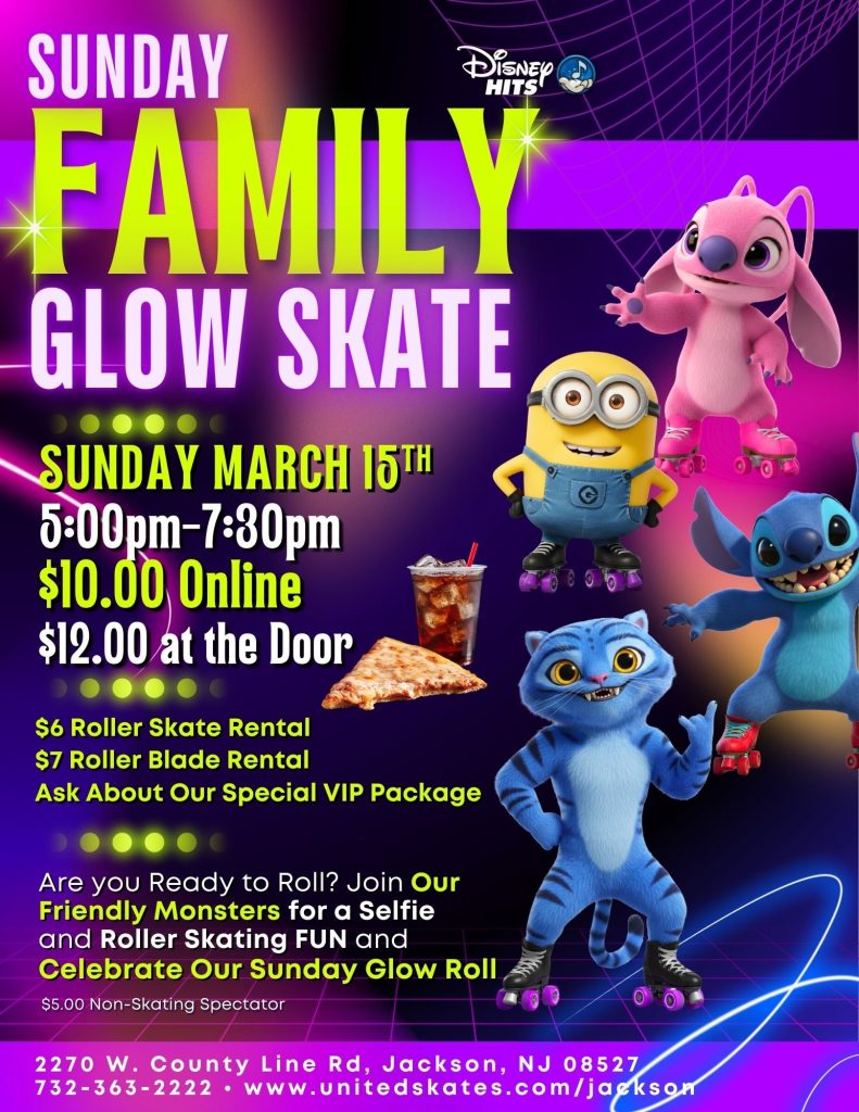 Bring the whole family out for our Sunday Family Glow Skate featuring glow lights, music, skating fun, and some friendly monsters ready for selfies!