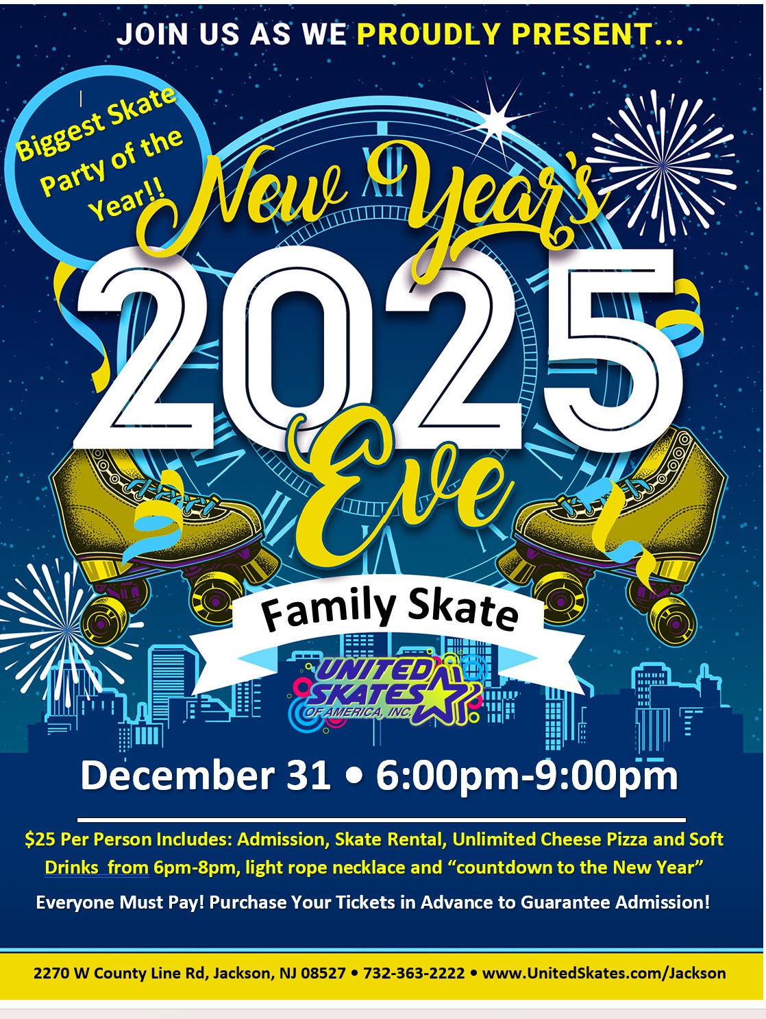 Countdown to the New Year 2025! $25 Admission Per Person, Includes Skate Rental, Unlimited Cheese Pizza and Soft Drinks (From 6:00 pm - 8:00 pm), Light Rope & Necklace