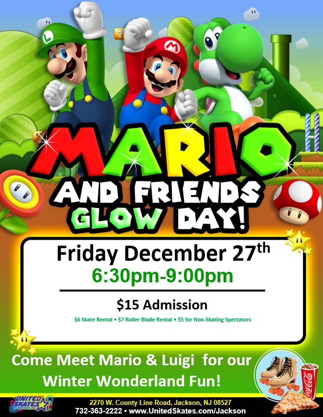 Meet Mario & Luigi in a Winter Wonderland of Fun! $15 Admission $6 Skate Rental $7 Roller Blade Rental $5 Spectator Fee