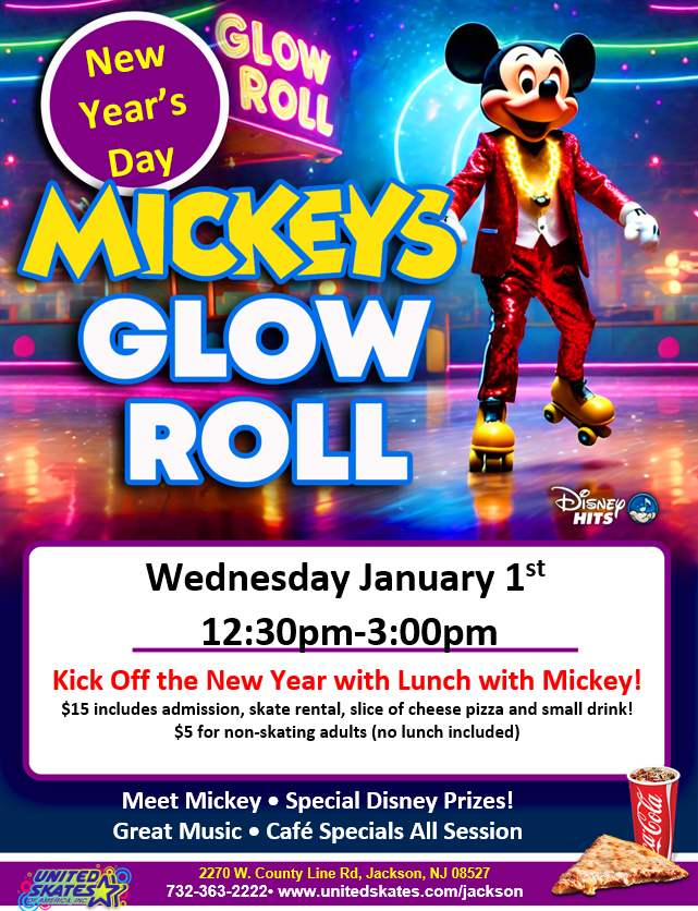 Lunch with Mickey is the Only Way to Kick Off 2025! Meet Micky, Special Disney Prizes, Great Music and Cafe Specials $15 Admission, Includes Skate Rental, Slice of Cheese Pizza & Small Drink $5 Spectator Fee (Food Not Included)