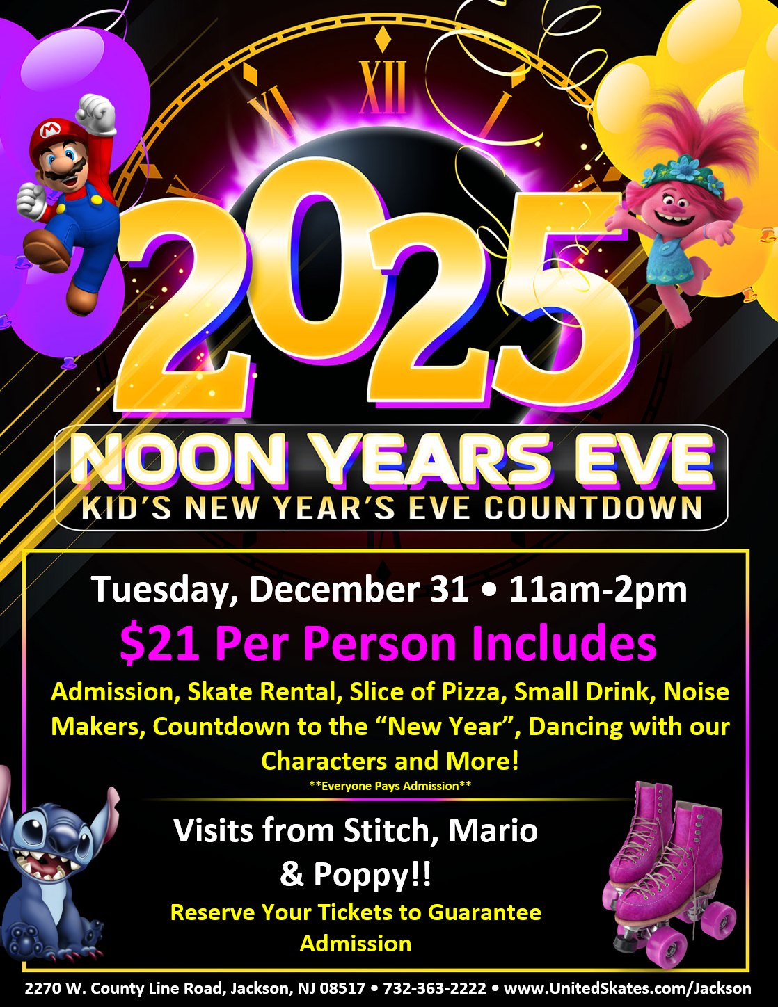 Skate Into the New Year With Our Kid's Countdown to "Noon" Year's Eve Visits From Stitch, Mario & Poppy! $21 Admission Per Person, Includes Skate Rental, Slice of Pizza, Small Drink, Noise Maker, Countdown, Dancing with Our Characters, & More! https://www.eventbrite.com/e/1079281482969?aff=oddtdtcreator
