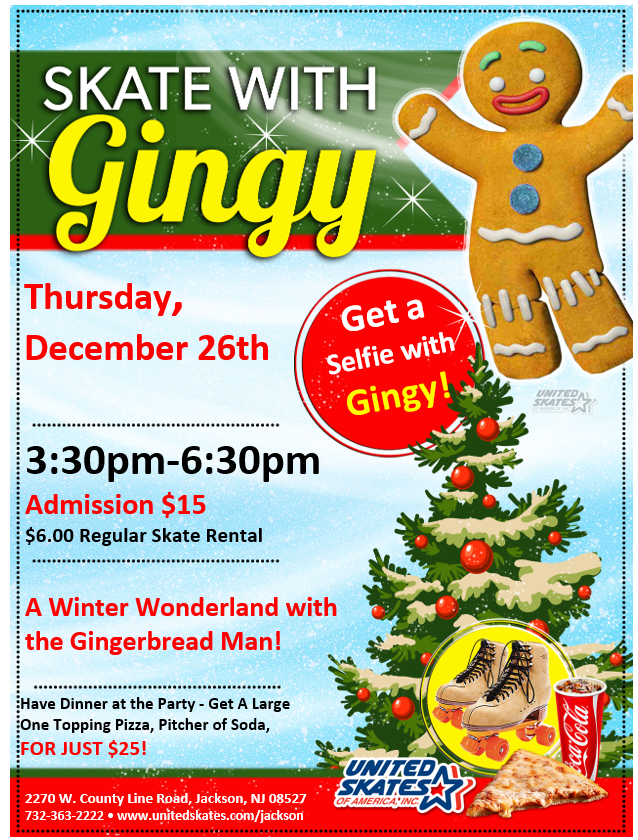 A Winter Wonderland with the Gingerbread Man Awaits! Don't Forget to Get Your Selfie With Gingy! Pizza Special Available: Large One Topping Pizza & Pitcher of Soda for $25 $15 Admission $6 Regular Skate Rental