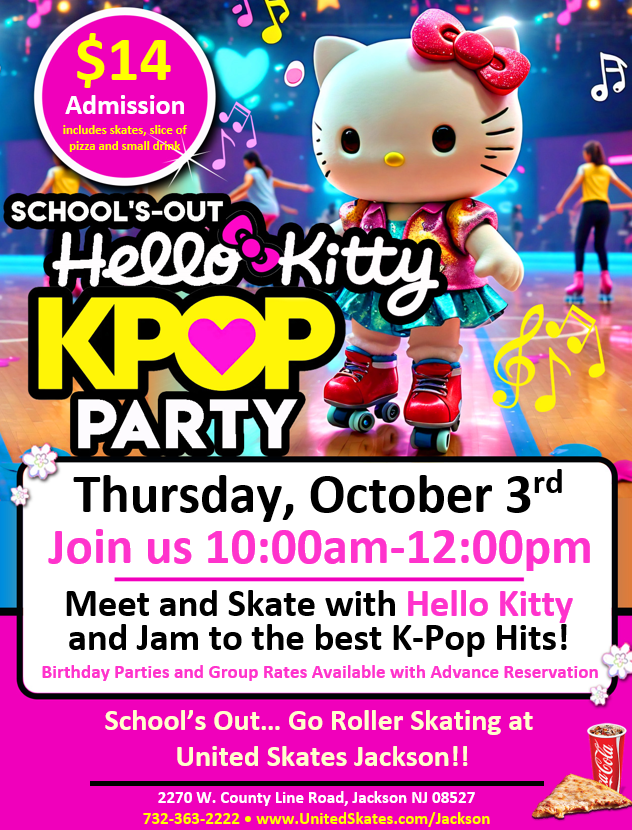 Wear Your favorite Hello Kitty Gear! We are roller skating together! Bring the kids and lace up for some family fun. Experience roller skating and share in building memories together. We look forward to welcoming you into our newly renovated facility in the beautiful Jackson Township, NJ Admission $14 Skate Rental $6.00 extra info: […]