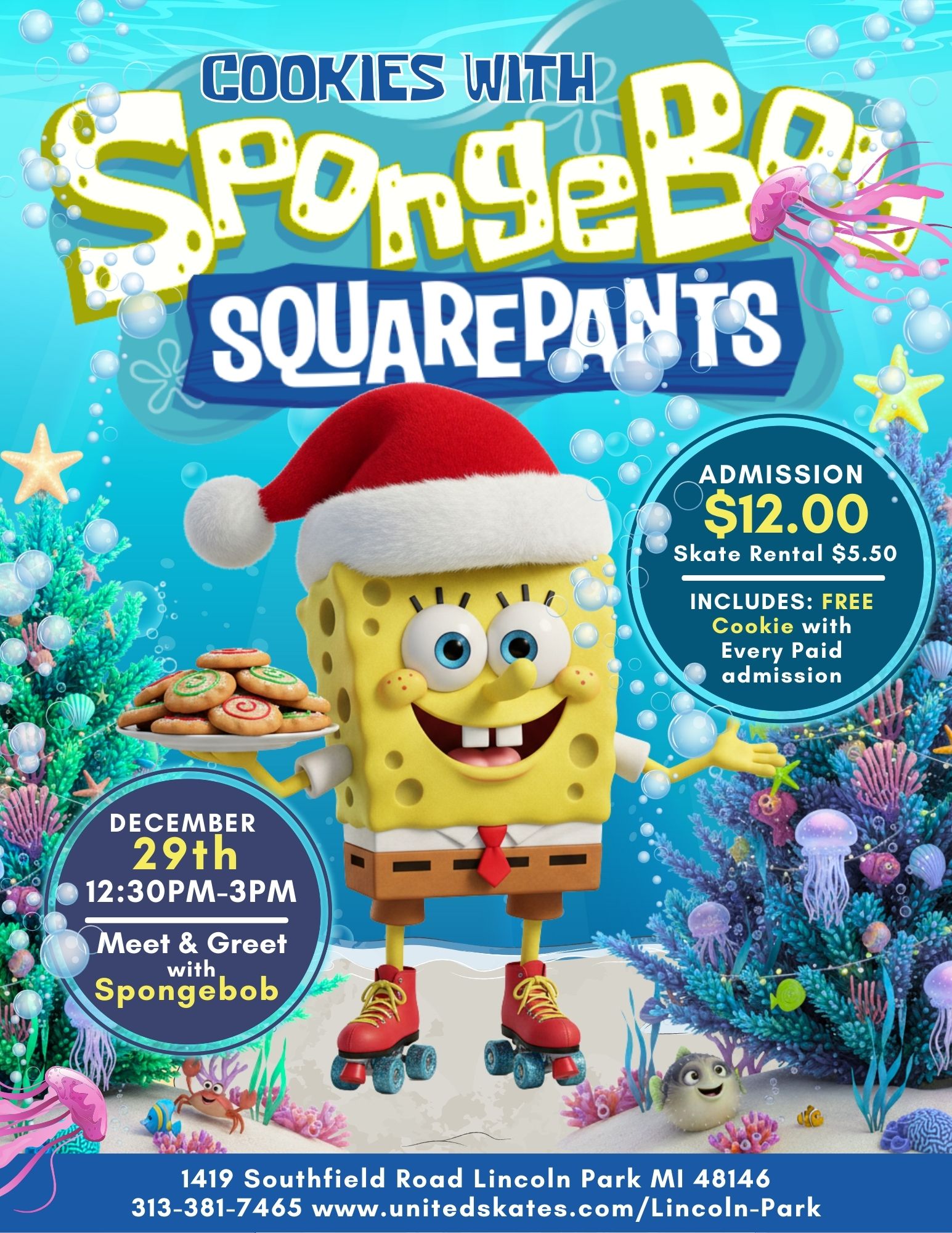 Straight from Bikini Bottom, SpongeBob is visiting the rink and bringing a delicious surprise! Skate, laugh, and enjoy a fun-filled afternoon β and donβt forget to grab your FREE cookie with paid admission! βΈοΈβ¨