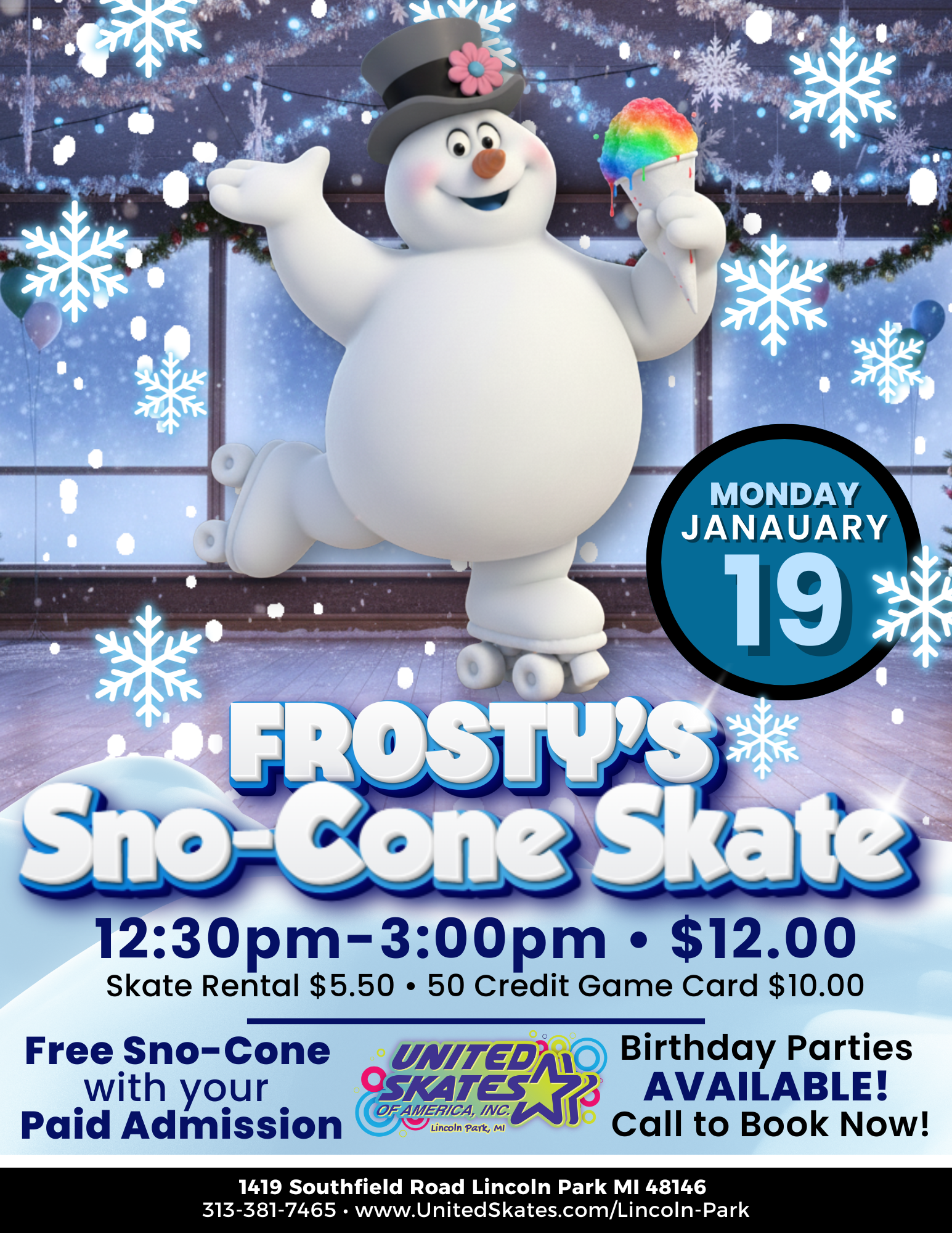 Get ready for a frosty-cool afternoon of skating fun because Frosty’s Sno Cone Skate is here! Join us for a magical winter celebration filled with chilly treats, music, and family excitement.