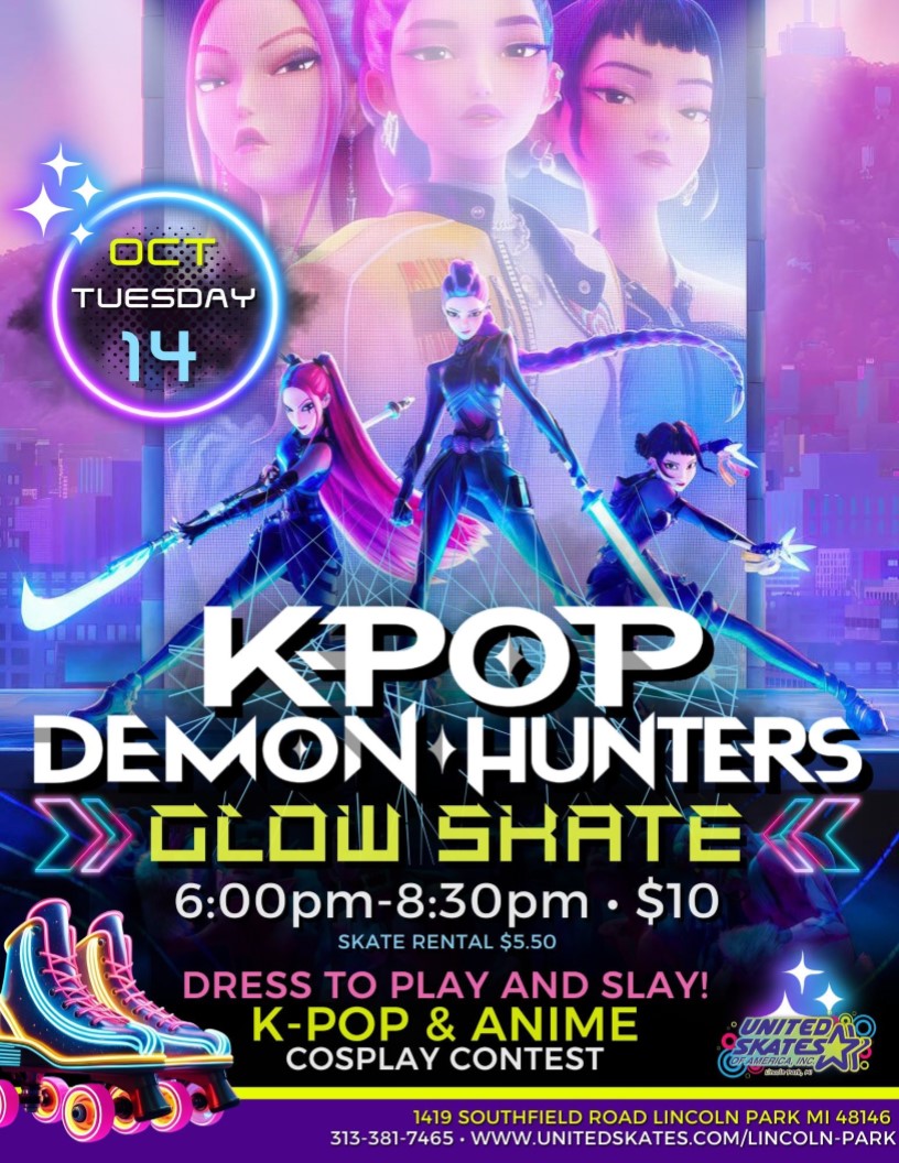 💥 K-POP DEMON HUNTERS GLOW SKATE 💥🛼 Get ready to light up the rink with your fiercest fit and anime attitude! ⚔️✨ 🎶 K-pop beats. 💫 Neon lights. 👹 Demon-slaying style. 📅 Tuesday, Oct 14 | ⏰ 6:00–8:30PM 📍 United Skates, Lincoln Park 🎟️ Admission: $10 | Skate Rental: $5.50 🎭 Cosplay Contest: DRESS TO PLAY AND SLAY!