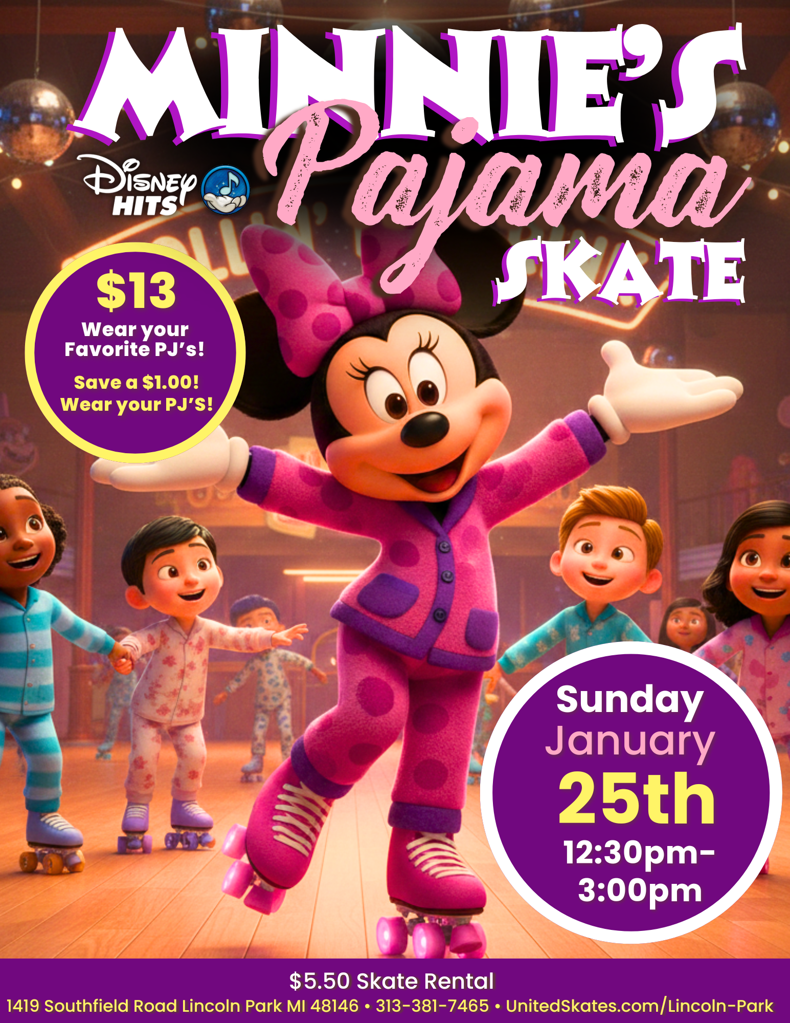 Get ready to roll into aΒ Sunday FundayΒ like no other! Join us at United Skates for aΒ pajama-themed skating adventureΒ withΒ Minnie MouseΒ herself. Come dressed in your favorite PJs and skate the afternoon away with fun, music, and lots of smiles!