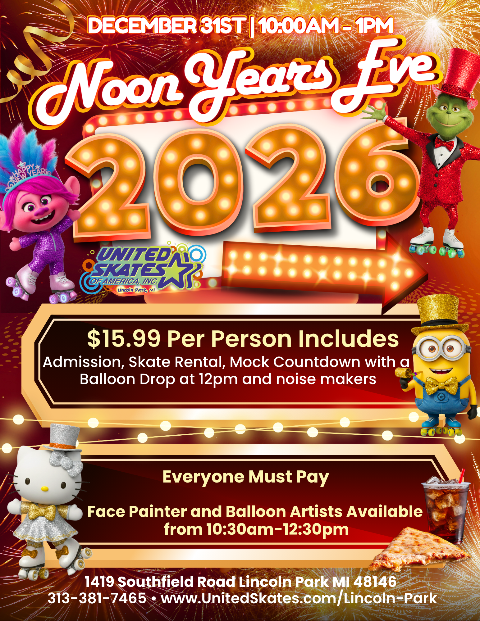 Get ready to ring in the New Year early with our fun-filled Noon Year’s Eve Party! Skate, celebrate, and enjoy all the festive fun designed for the whole family. 🌟✨