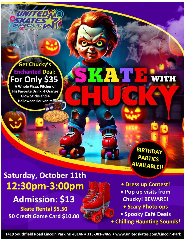 Chucky is BACK and ready to ROLL… if you dare! 👀 Come face-to-face with your favorite doll for a thrill-packed afternoon of skating, scares, and fun!