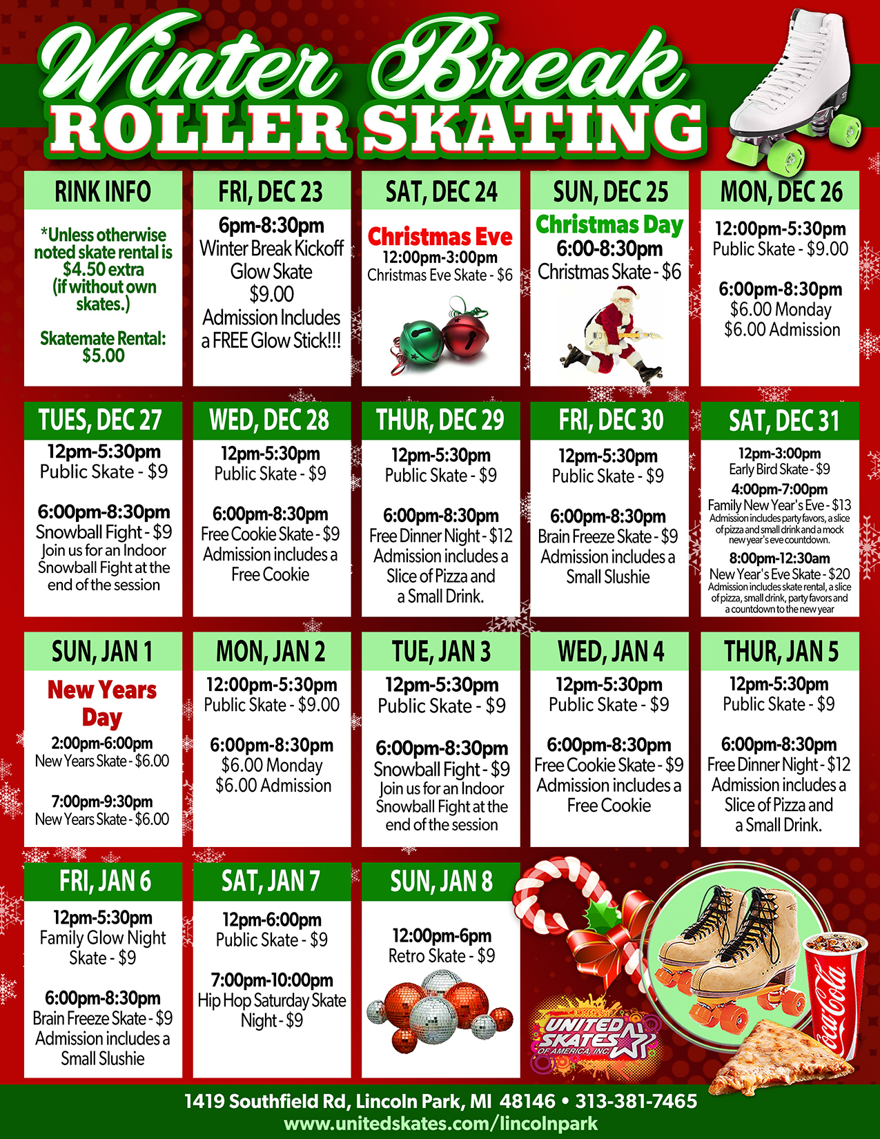 Winter Break Roller Skating is Friday, December 23rd 2022 through Sunday, January 8th 2023.