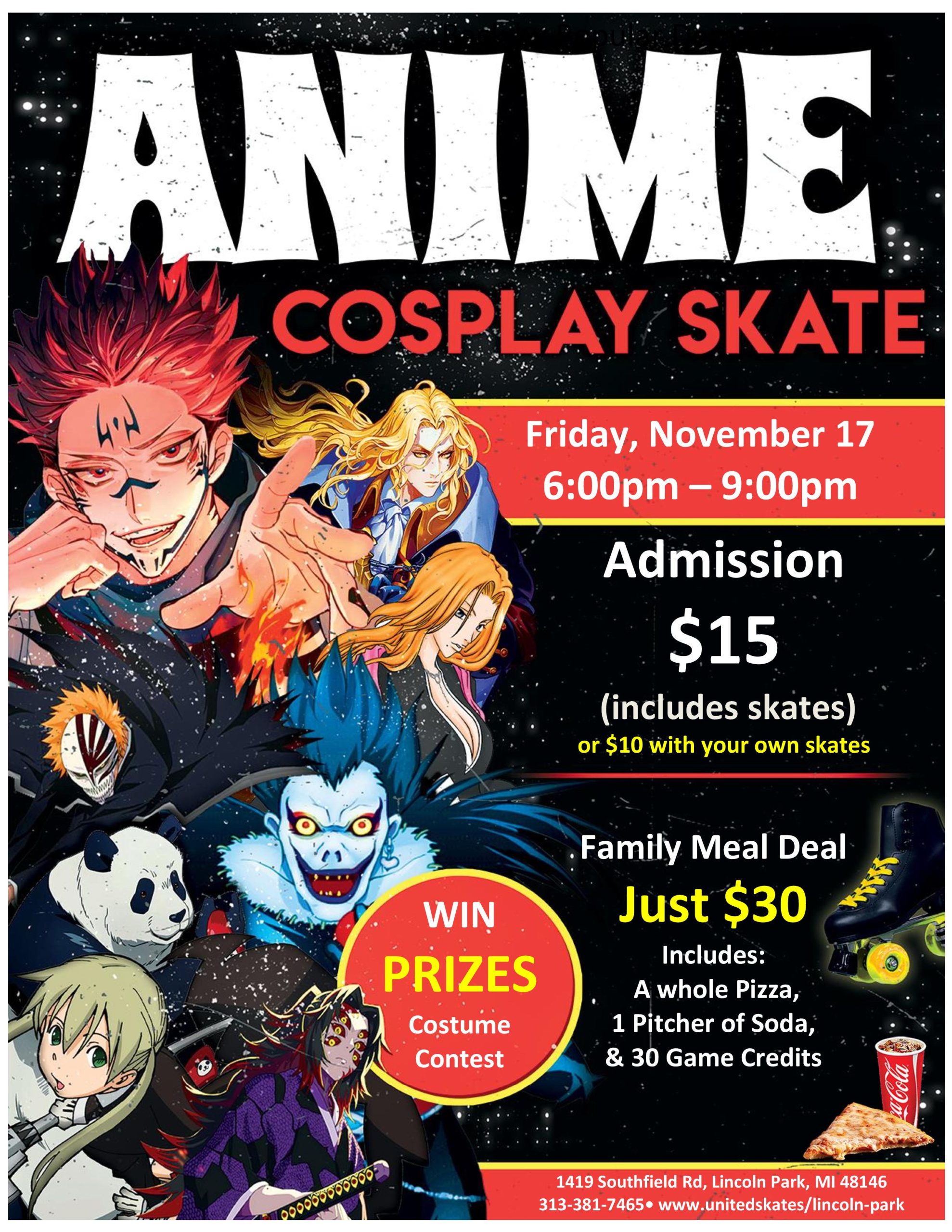 It's time to Cosplay! Calling all Anime and Cosplay Lovers this night is for you! Come out dressed in your best Anime! Costume Contest! Prizes and More! Friday, November 17th 6:00pm-9:00pm Admission $10.00 Skate Rental $5.00 Rollerblade Rental $6.50 |