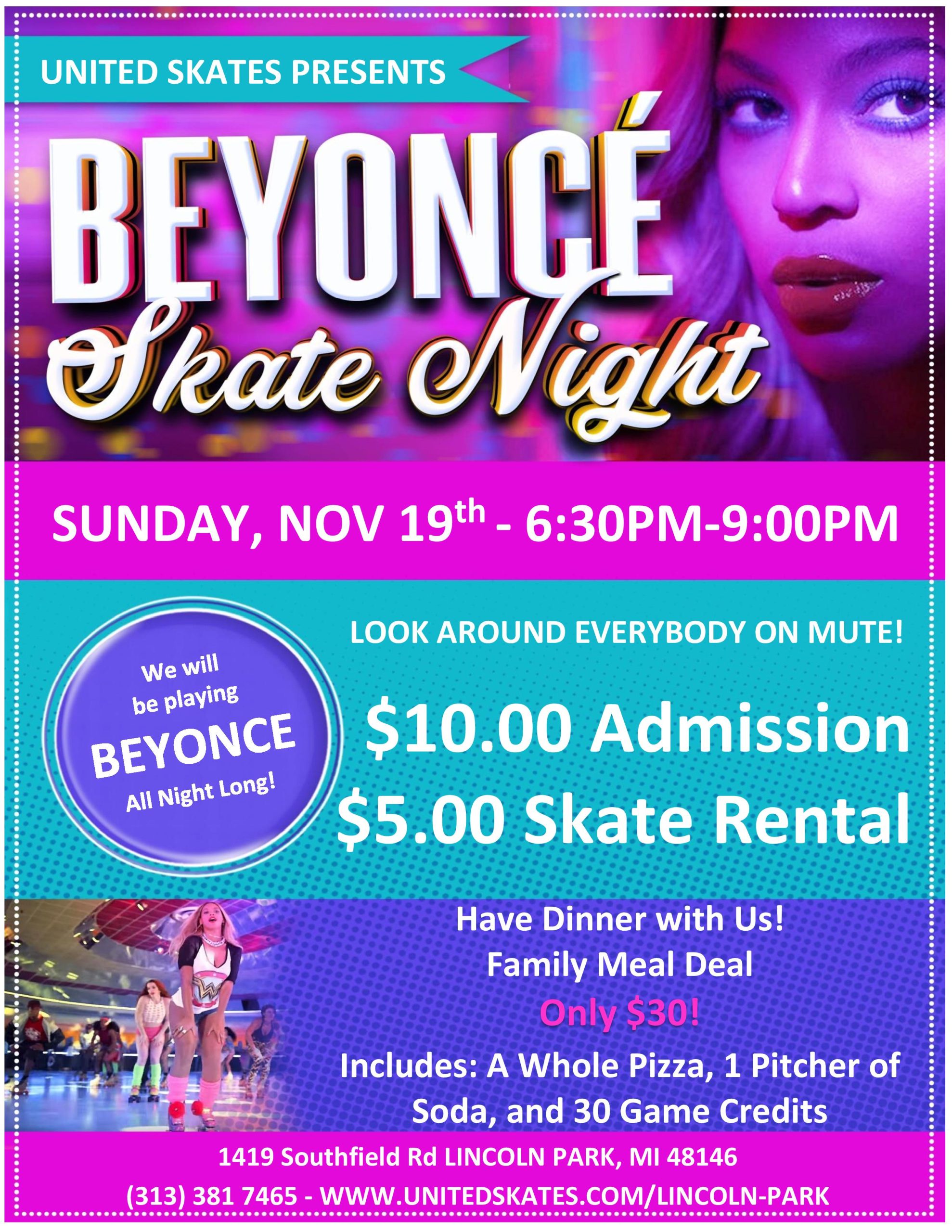 Calling all Bey Hives! We are dedicating a whole session to Beyonce! Sunday, November 19th 6:30pm-9:00pm Admission $10.00 Skate Rental $5.00 Rollerblade Rental $6.50 We will be playing Beyonce Music ALL session long! Come dressed in your best Beyonce gear! |