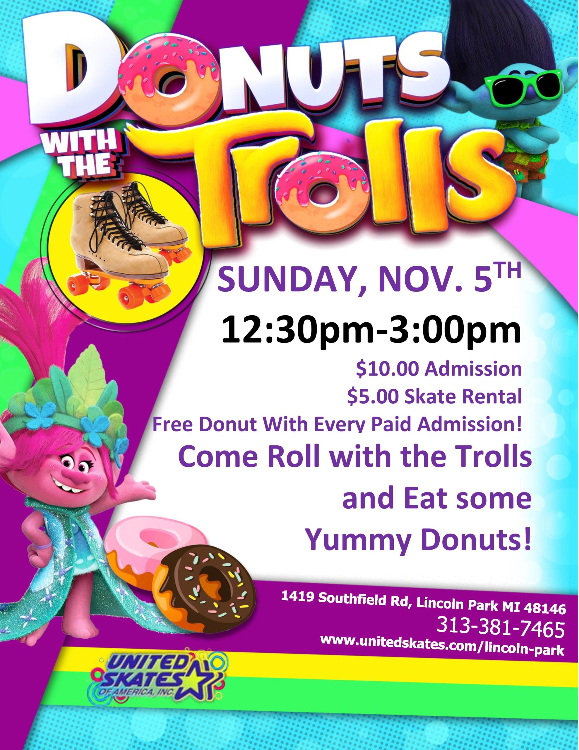 It's Sunday Funday! We are doing a Donut Skate, there is no better way to spend Sunday We even have a special appearance coming THE TROLLS Sunday, November 5th from 12:30pm-3:00pm Admission $10.00 Skate Rental $5.00 Rollerblade Rental $6.50 Get a FREE donut with every paid admission |