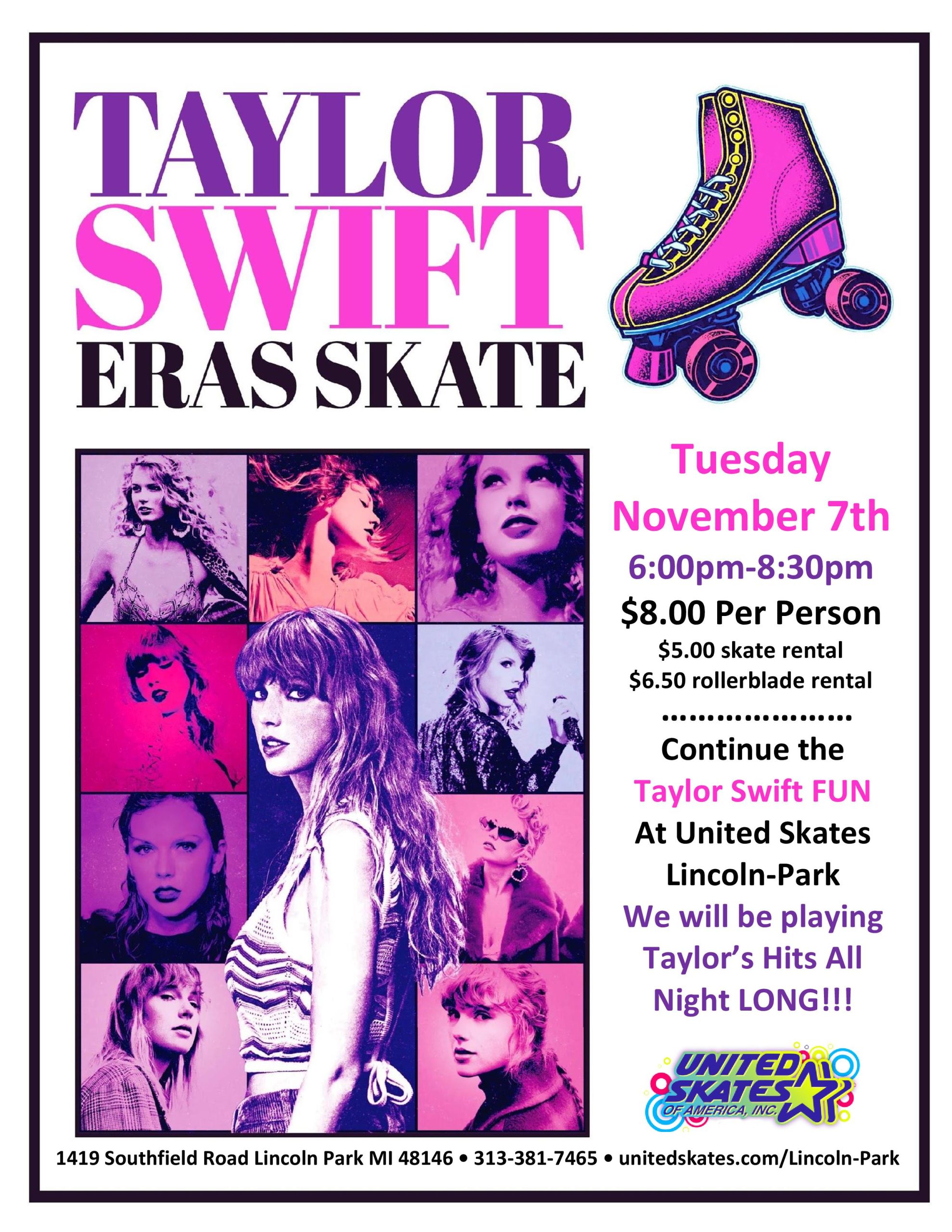 Swifties!!! It's back! We are once again dedicating a whole session to Taylor Swift! We will be playing music from all her era's, from country to pop music Tuesday, November 7th 6:00pm-8:30pm Admission $8.00 Skate Rental $5.00 Rollerblade Rental $6.50 |