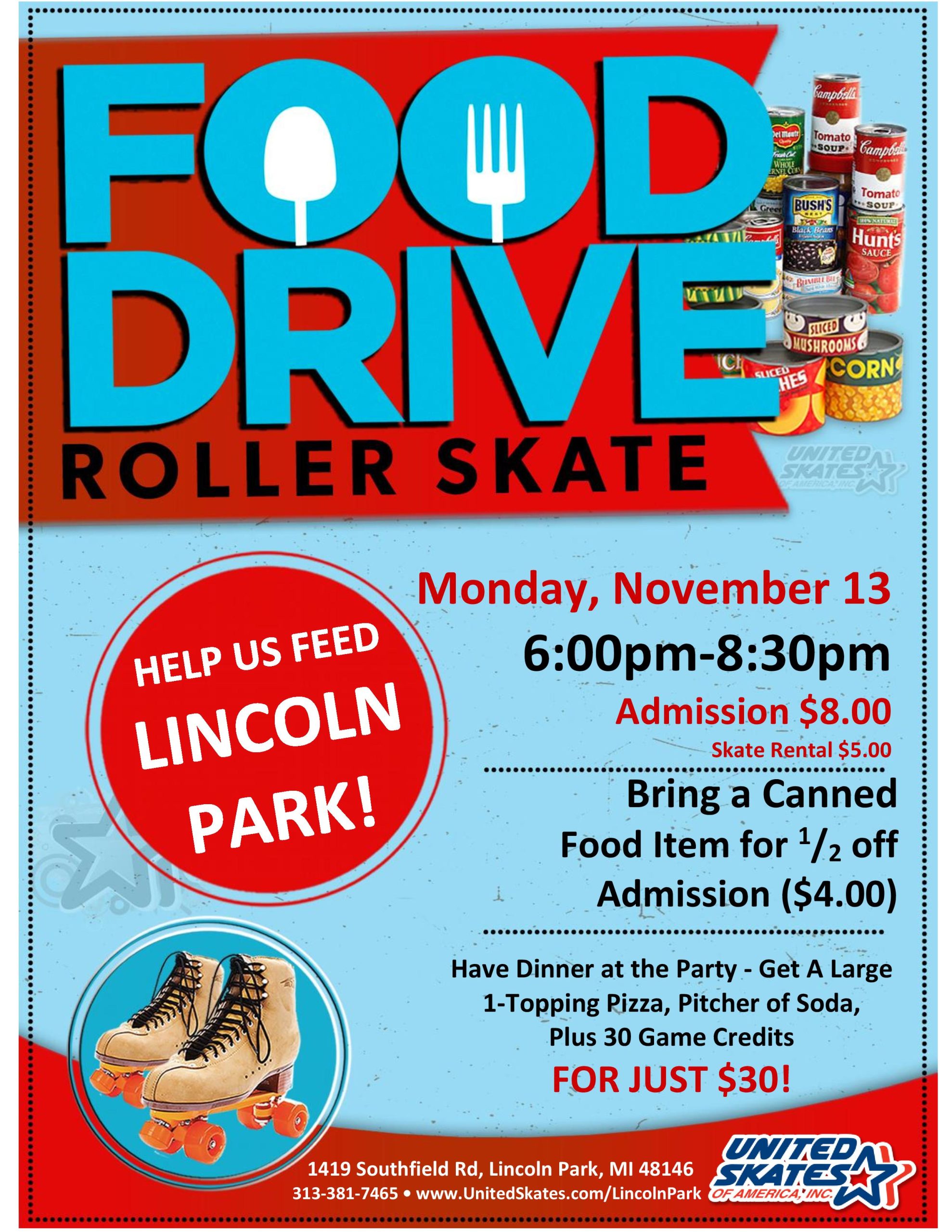 Are you ready to give back to our community? Help us feed Lincoln Park! Bring your families and friends down for some fun on the rink while giving back to others. Monday, November 13th 6:00pm-8:30pm Admission $8.00 Skate Rental $5.00 Rollerblade Rental $6.50 Bring in a canned food or non-perishable food item and get 1/2 […] |