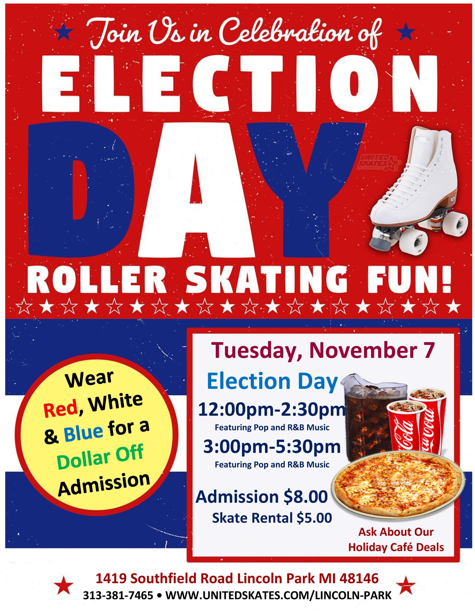School's Out! Let's Skate!! We are OPEN ALL Day Long! Bring your families and friends! Tuesday, November 7th 12:00pm-2:30pm and 3:00pm-5:30pm Admission $8.00 Skate Rental $5.00 Wear Red, White and Blue and get $1.00 off your admission