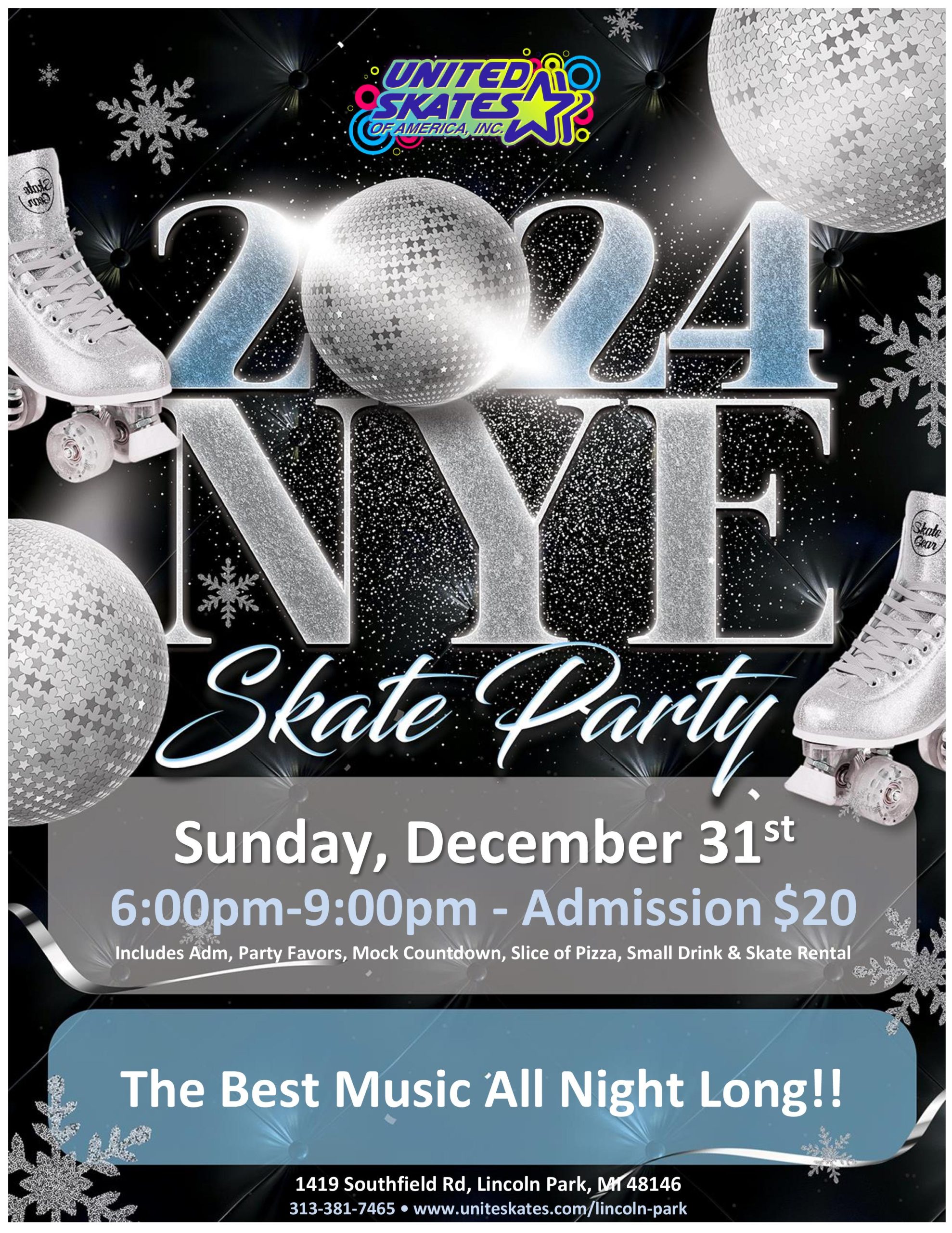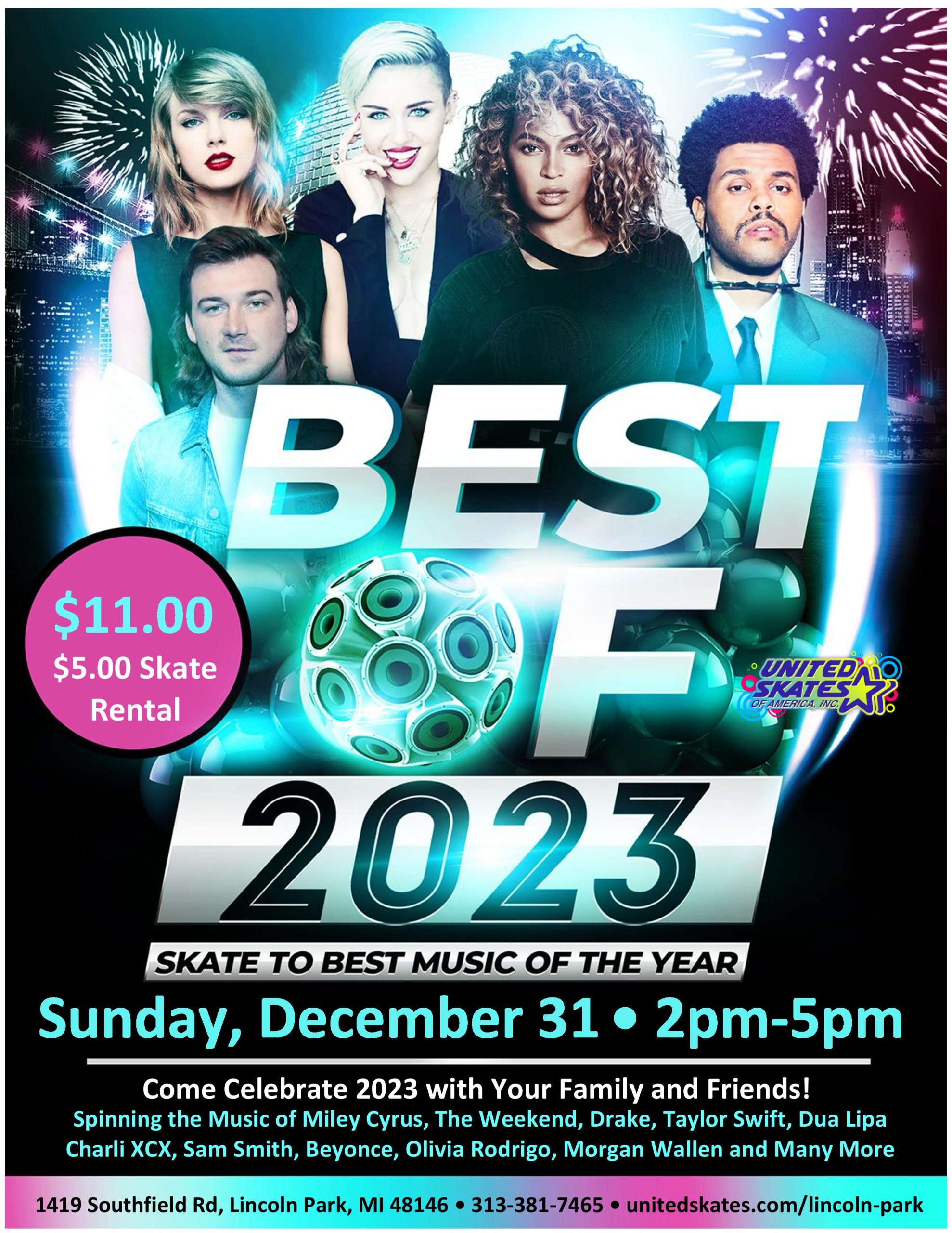 It's time to look back at 2023! Come out and Skate to the greatest hits from the whole year! Music from The Weekend, Drake, Taylor Swift, Beyonce, Morgan Wallen and More! Sunday, December 31st 2:00pm-5:00pm Admission $11.00 Skate Rental $5.00 FUN for ALL Ages!