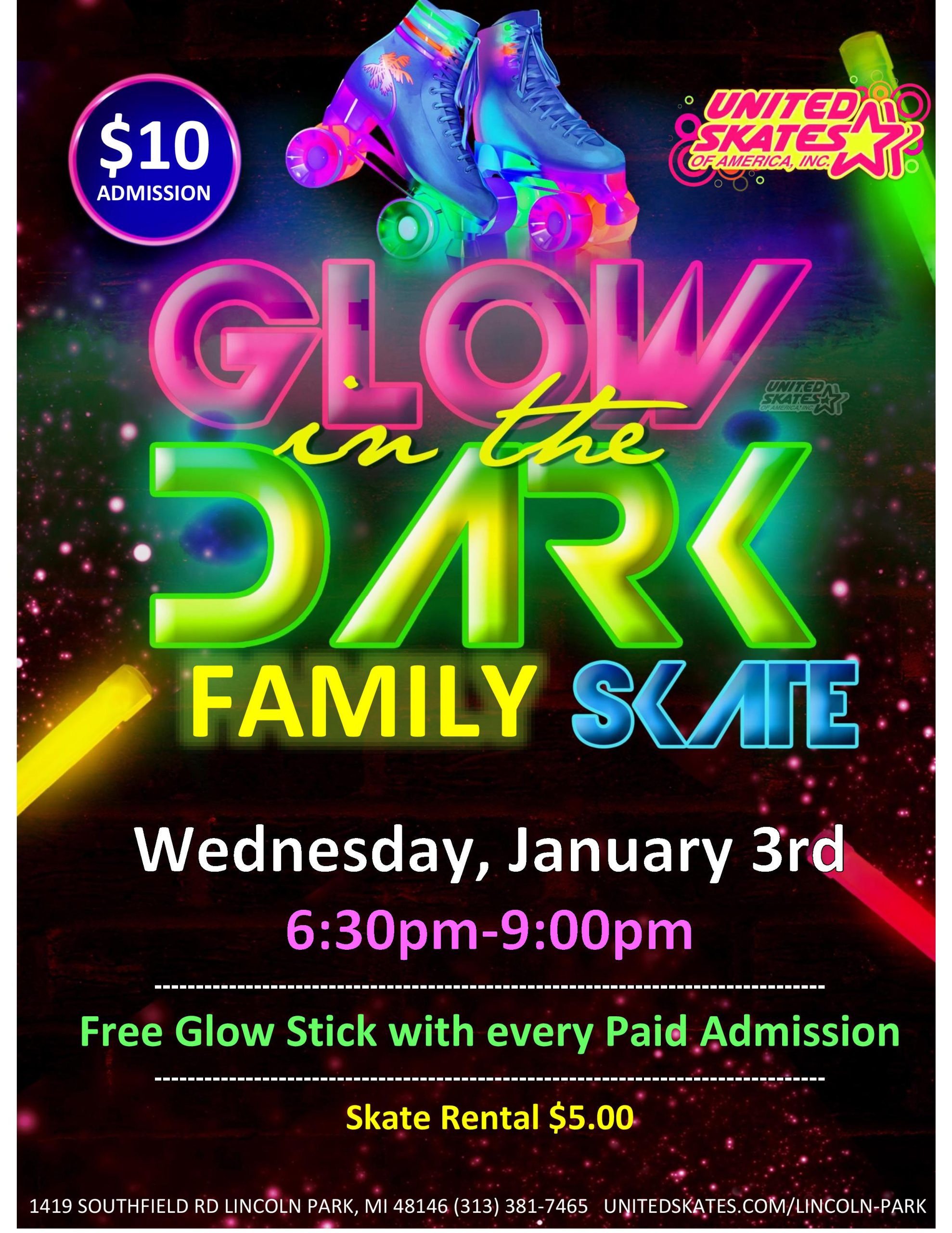 It's Family Time on the skating rink! Break out your white, neon, brightest clothes you have and come glow! Wednesday, January 3rd 6:30pm-9:00pm Admission $10.00 Skate Rental $5.00 Free Glow stick with every paid admission