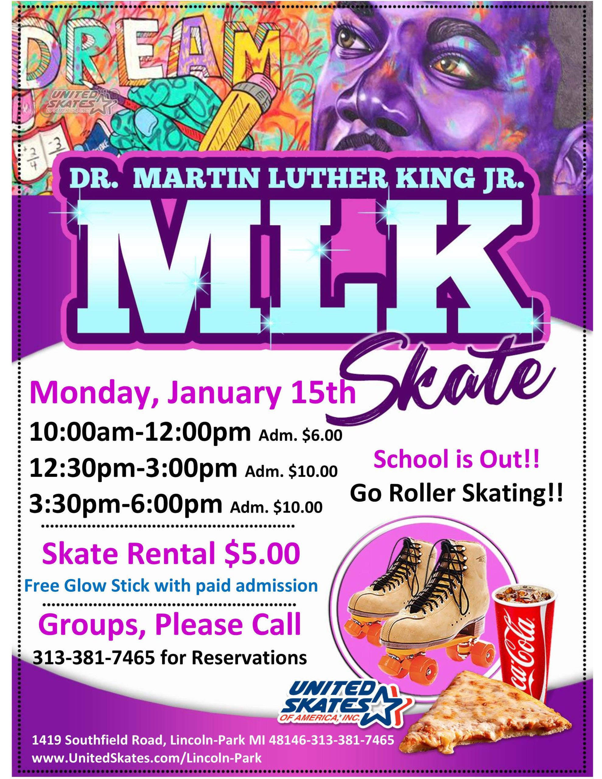 It's Martin Luther King Jr. Day! School's Out, it's time to skate! Come out with your families and friends and get your Glow on. We are Open ALL Day Long! Monday, January 15th 10:00am-12:00pm Admission $6.00 12:30pm-3:00pm and 3:30pm-6:00pm Admission $10.00 Skate Rental for all sessions $5.00 Get a FREE glow stick with every paid […]
