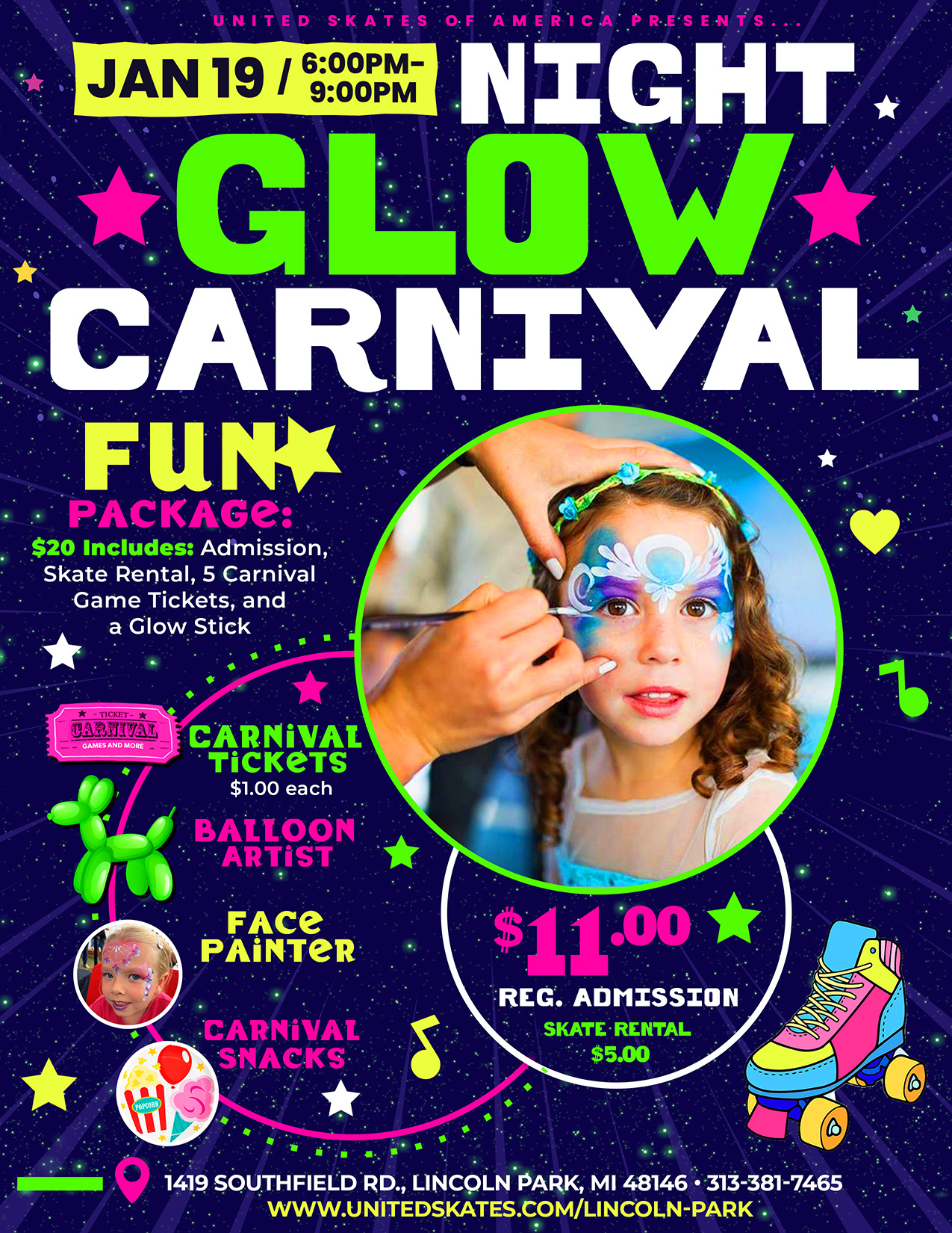We love Carnivals, don't you? You do not need to wait for Summer to have a Carnival! Come out to United Skates Lincoln Park and see our very first Night Glow Carnival! We will have the lights down, carnival games, face painter and MORE! Friday, January 19th 6:00pm-9:00pm Get our Fun Package only $20.00 includes […]