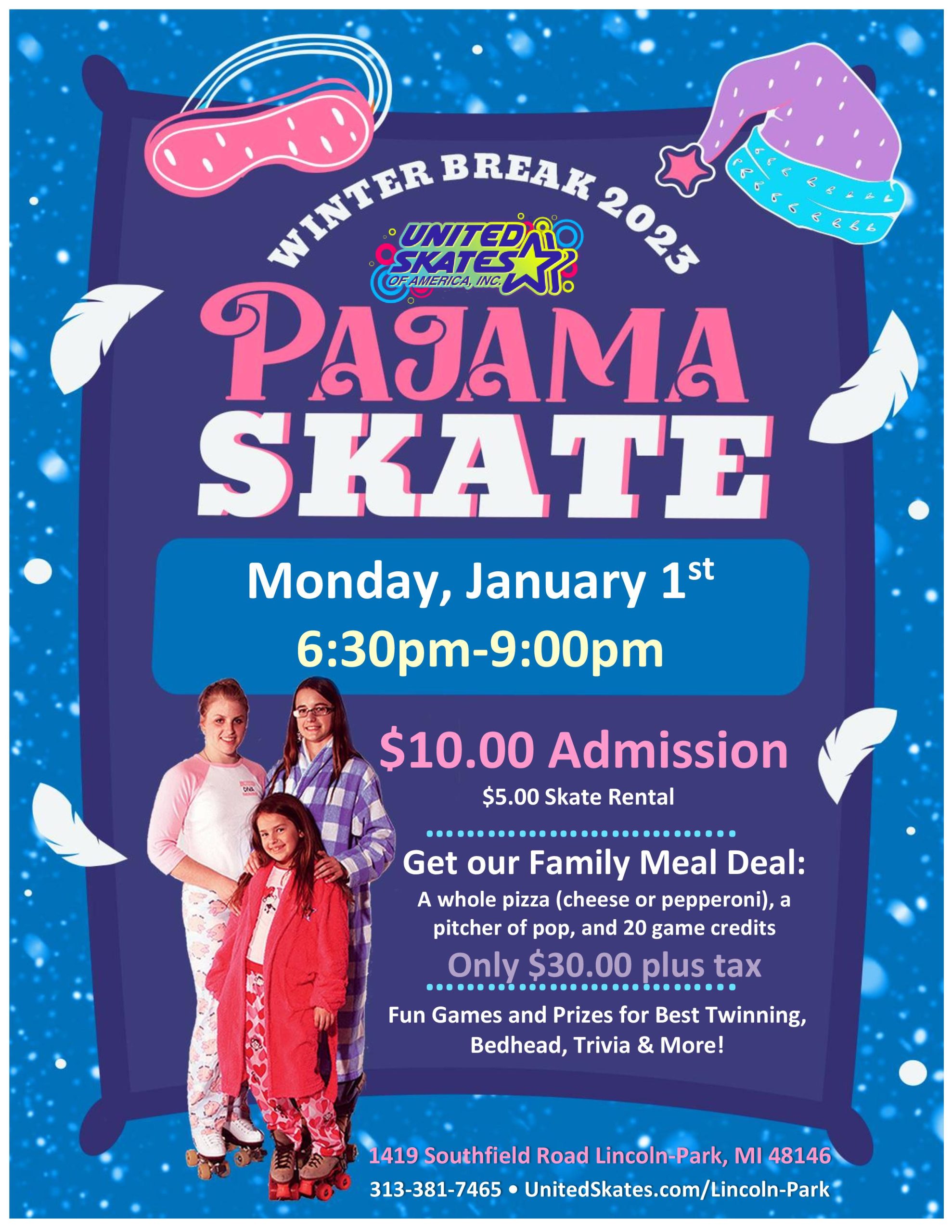 It's Pajama Time! We want to see the best Twinning, Bed Heads and more! You may even win a Prize! End your New Years Day on the right skate! Monday, January 1st 6:30pm-9:00pm Admission $10.00 Skate Rental $5.00