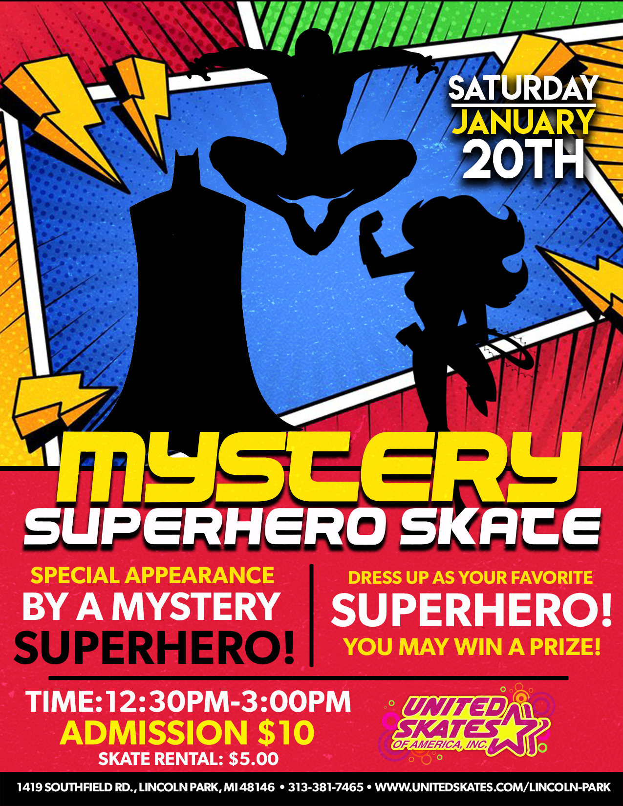 He is running all the way to United Skates Lincoln Park! He wants to see all of you for the end of Winter Break! Come out on Friday, January 5th 12:30pm-3:00pm Admission $10.00 Skate Rental $5.00 If you are fast enough, you might be able to capture a picture!