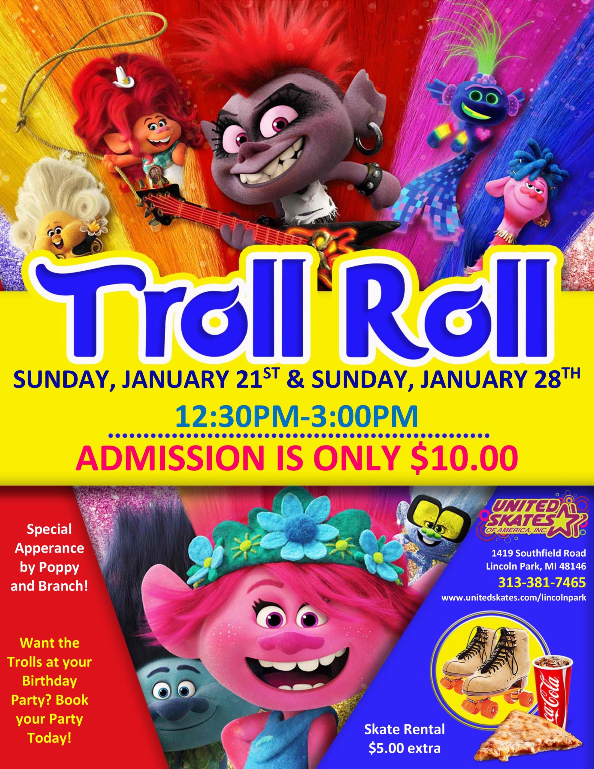 We are ready to Roll with the Trolls, are you? Well, they are making a special appearance on 2 Sunday Afternoons! This means you'll have 2 chances to come out and see them! Princess Poppy and Branch are waiting for you! Sunday, January 21st and Sunday, January 28th 12:30pm-3:00pm Admission $10.00 Skate Rental $5.00 Make […]