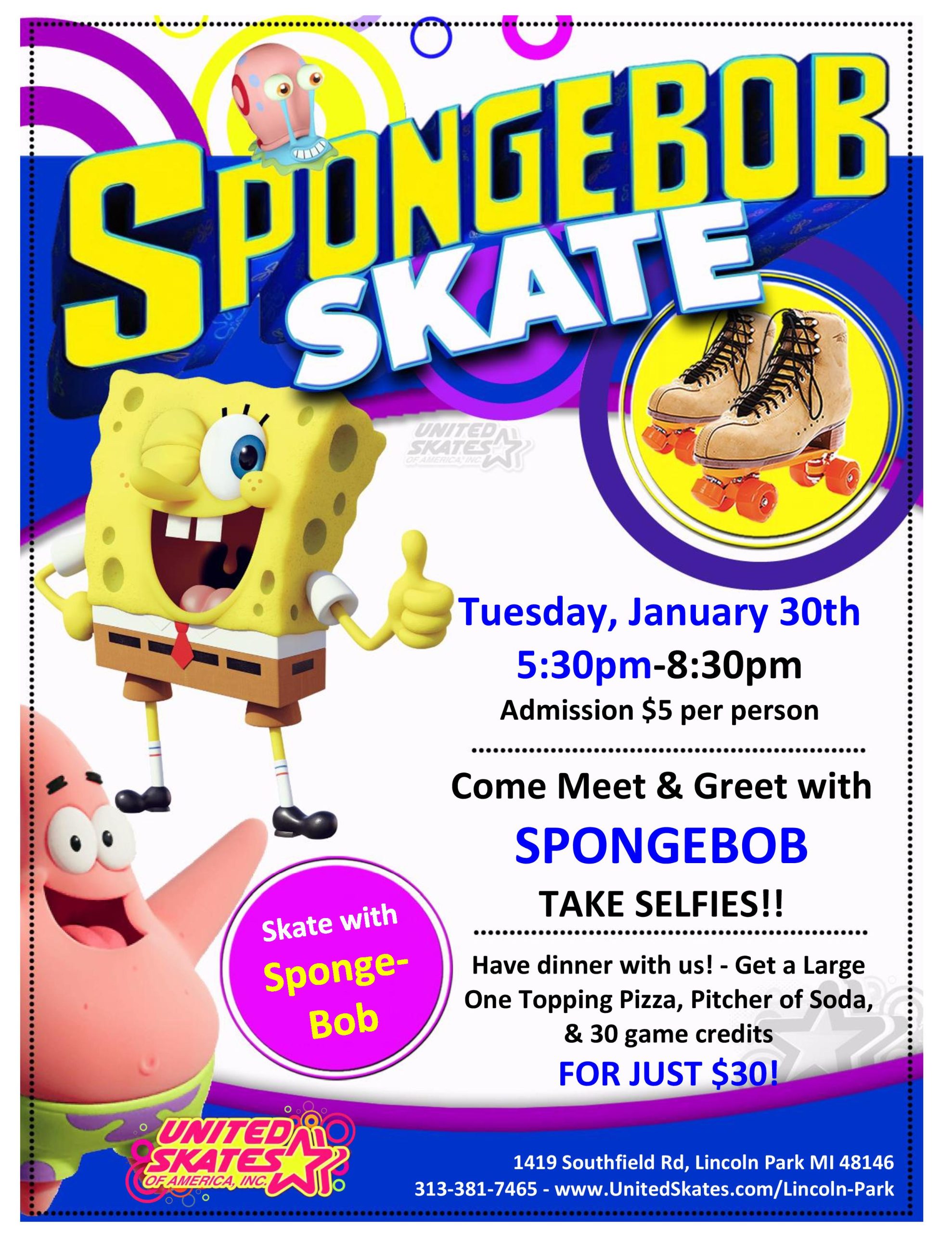 Look at this!! SpongeBob is making a Spontaneous trip to US! Only Tonight Tuesday, January 30th 5:30pm-8:30pm Admission only $5.00 Skate Rental $5.00 Picture Opportunities are available!