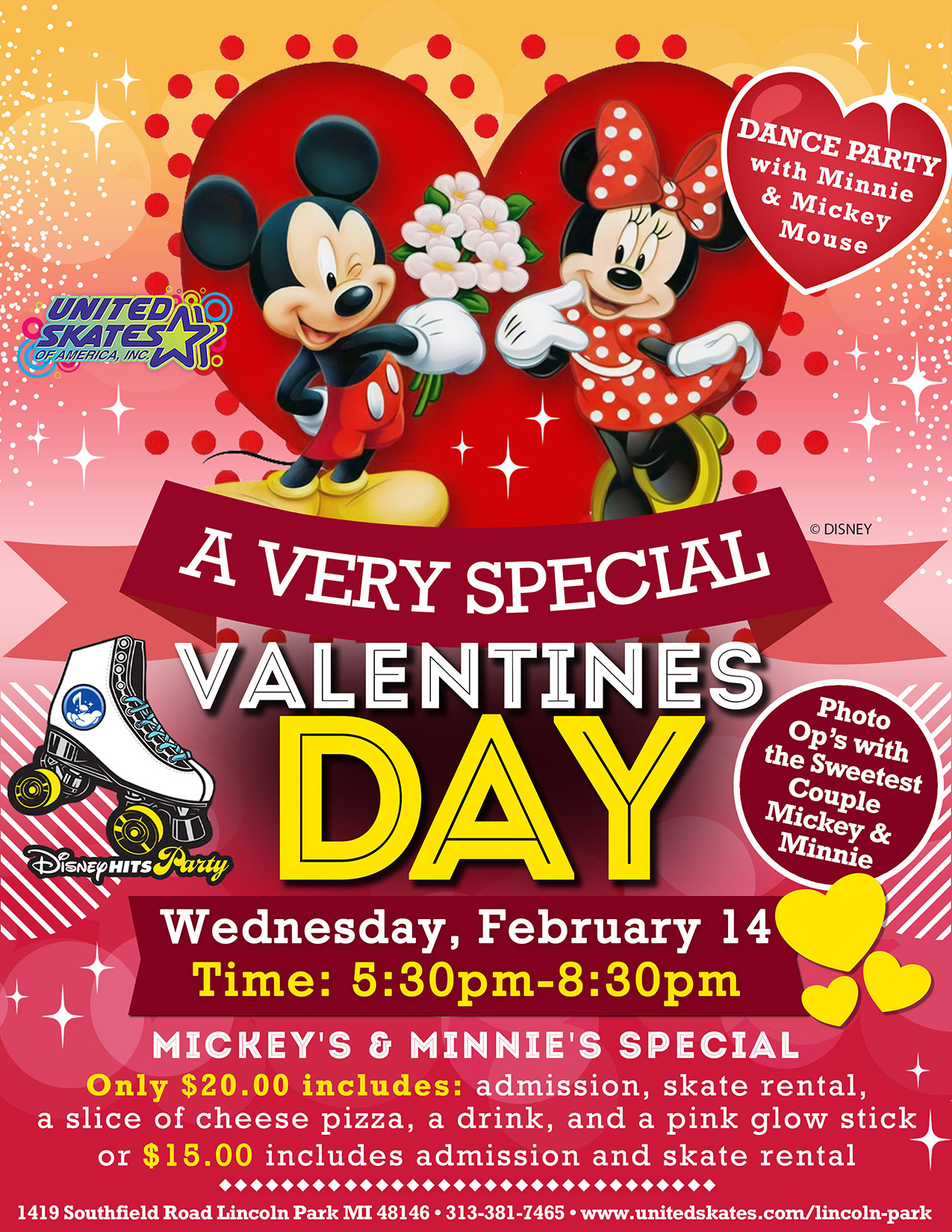 It’s Valentines Day!!! Look who is coming back to celebrate it with you!! Mickey and Minnie are coming to spread the LOVE! Wednesday, February 14th 5:30pm-8:30pm Get Mickey and Minnie’s Special for only $20.00 includes admission, skate rental, a slice of cheese pizza, a drink and a pink glow stick or, $15.00 includes admission and […]