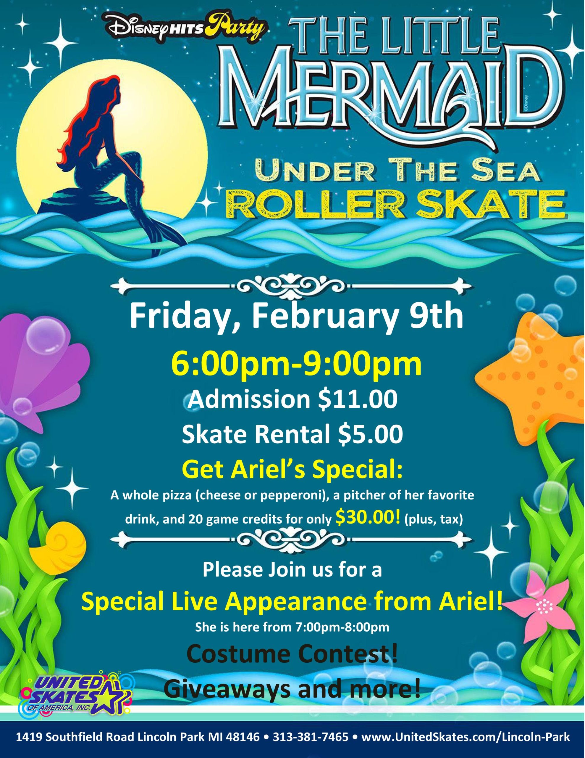 Look who is taking a break from the Sea Life. She is making her to way to see all of you at United Skates Lincoln Park! Friday, February 9th 6:00pm-9:00pm Admission $11.00 Skate Rental $5.00 Bring your Little Mermaid loving kids to a fun night out Want Little Mermaid at your birthday party! Book your […]