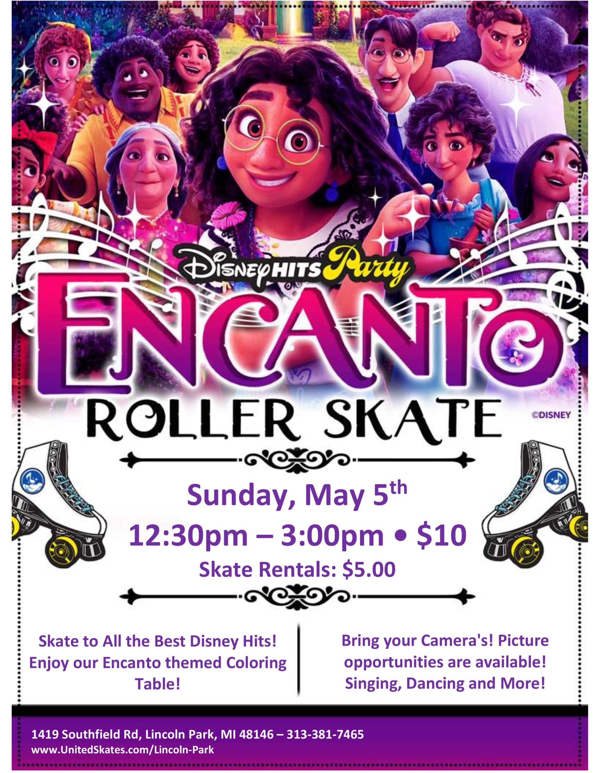 Bring your Encanto loving children out for an afternoon of FUN! Sunday, May 5th 12:30pm-3:00pm Admission $10.00 Skate Rental $5.00 Dress like your favorite character! Enjoy Encanto themed crafts and Music from the Movie! Want to have an Encanto themed birthday?! Book your Birthday NOW!