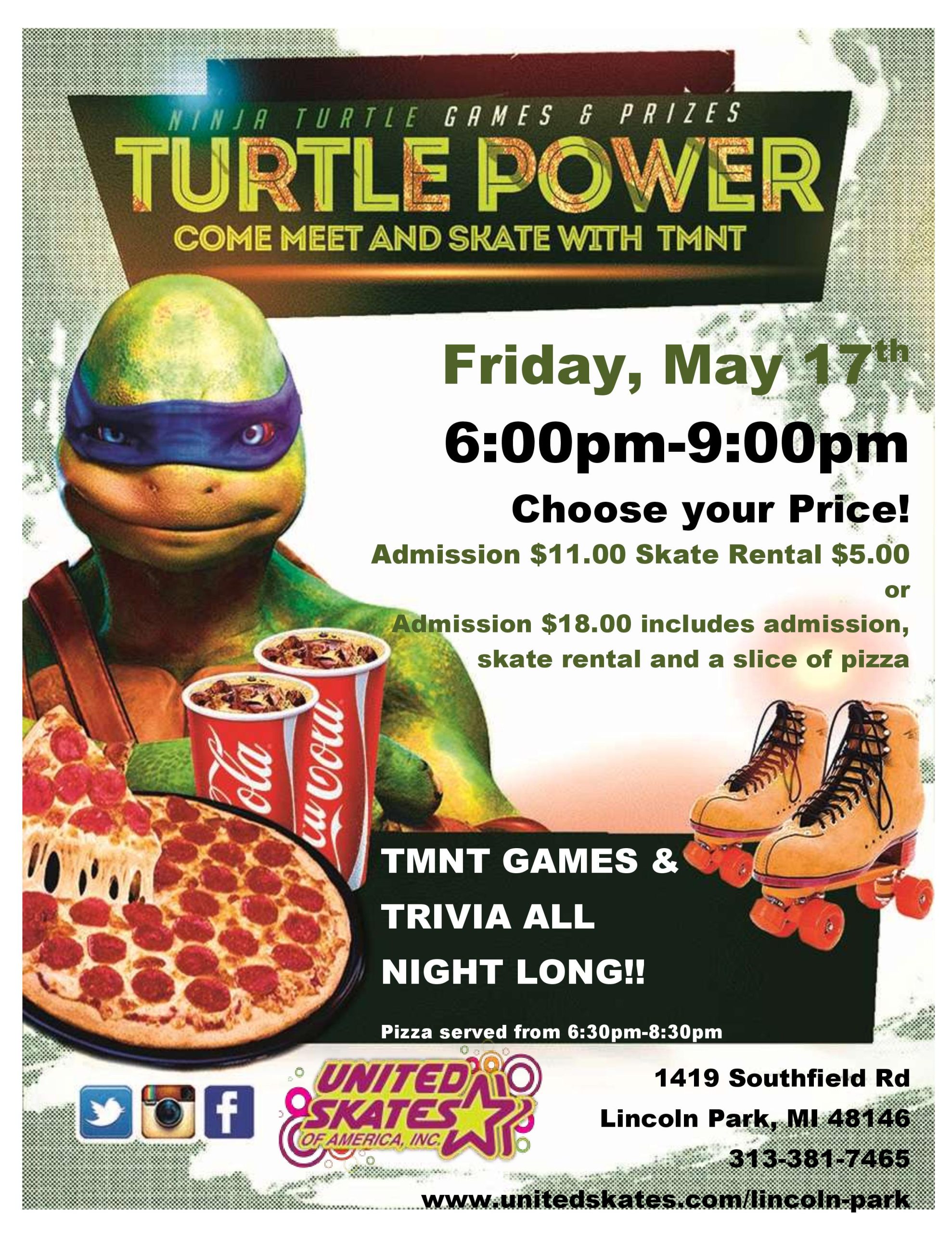 Today is National Pizza Party Day! We are Celebrating it with the Ninja Turtles, you know they love their pizza! Friday, May 17th 6:00pm-9:00pm You get to pick your own price Admission $11.00 and Skate Rental $5.00 OR $18.00 includes admission, skate rental, and a slice of cheese pizza Pizza is served from 6:30pm-8:30pm Make […]