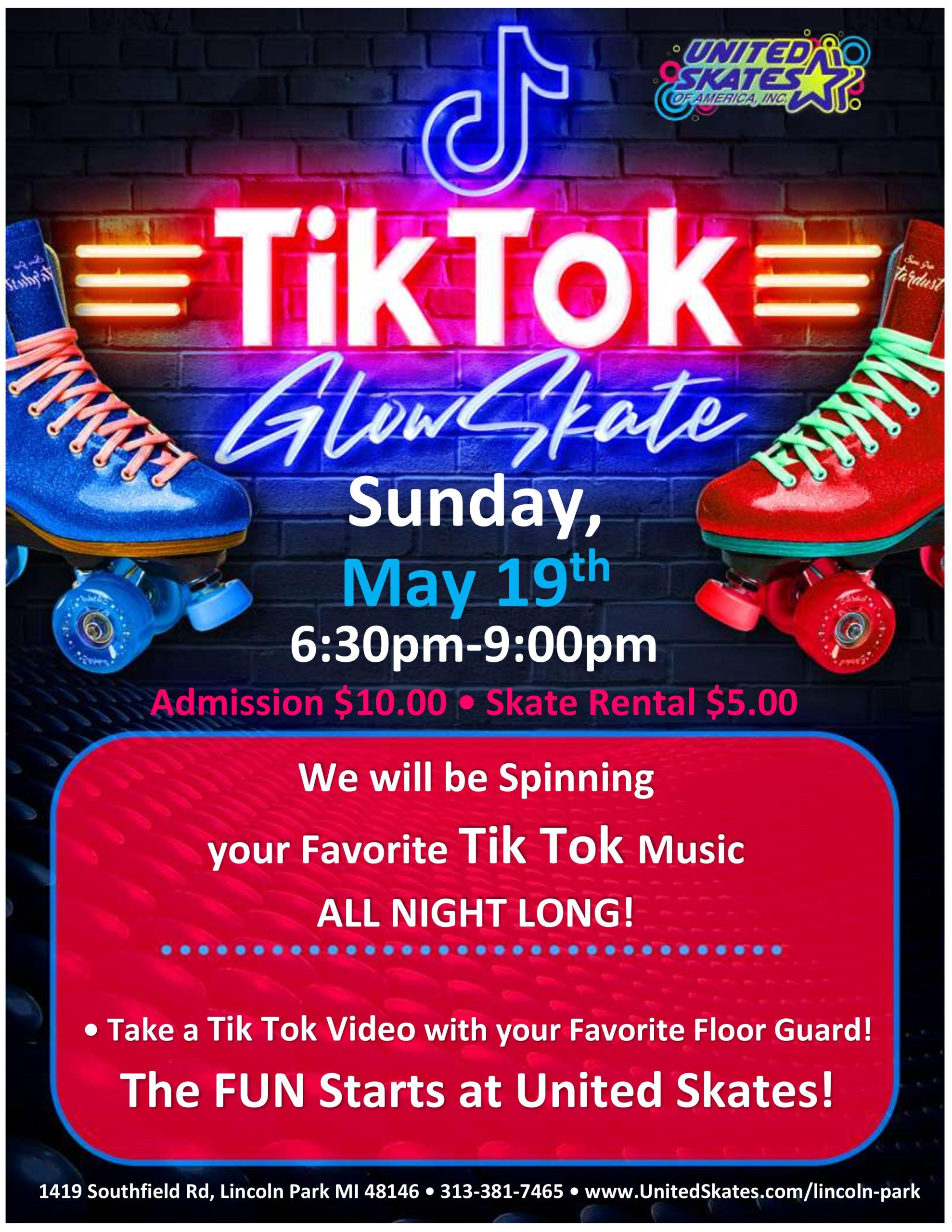 Who doesn’t love Tik Tok? Add Roller-Skating and now that’s Exciting! Tik Tok music all night long mixed with the most current Pop and R&B Music. Ready to do a Tik Tok video with a United Skates Team member? Here is your chance. Sunday, May 19th 6:30pm-9:00pm $10.00 Admission $5.00 Skate Rental Birthday Parties are […]
