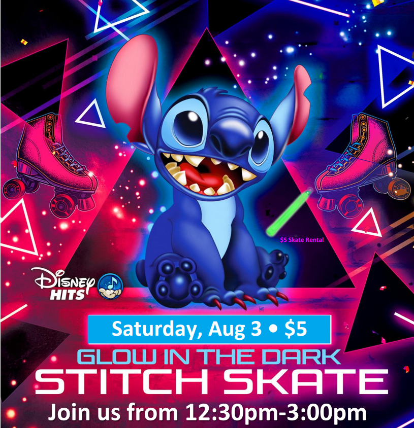 Get ready to GLOW with Stitch! Saturday August 3rd 12:30pm-3:00pm Admission $5.00 Skate Rental $5.00 |