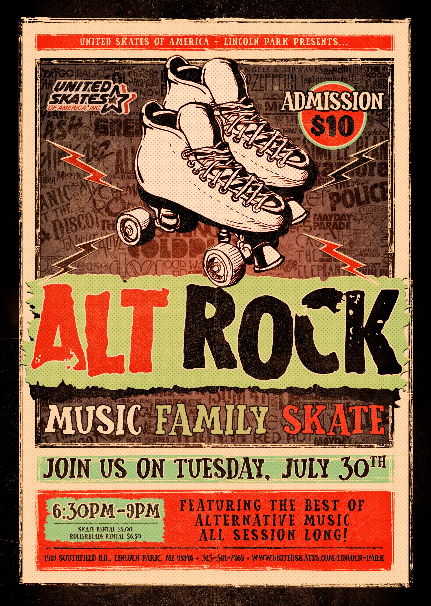 Birthday Parties Available! Book Today!! Are you ready to Rock?! We are!! We are playing the best of Alternative Rock ALL Session! Music from Nirvana, Foo Fighters, Pixies, Linkin Park and MORE! Fun for ALL Ages! Tuesday, July 30th 6:30pm-9:00pm Admission $10.00 Skate Rental $5.00 |