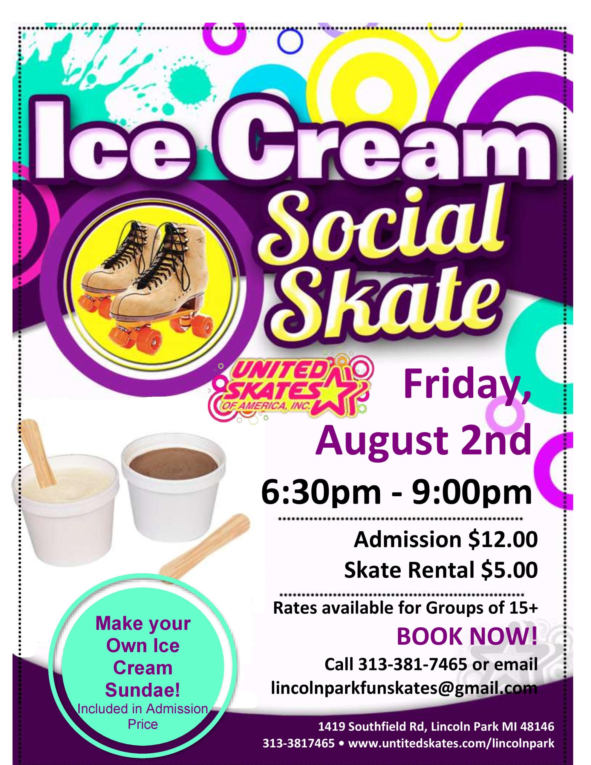 We have another sweet treat for YOU! Bring your ice cream-loving friends and family for a day of FUN! Friday, August 2nd 6:30pm-9:00pm $11.00 Admission $5.00 Skates You'll get a FREE ice cream with admission! We will even have a Sundae bar! Sprinkles, whipped cream, chocolate syrup, and MORE! |