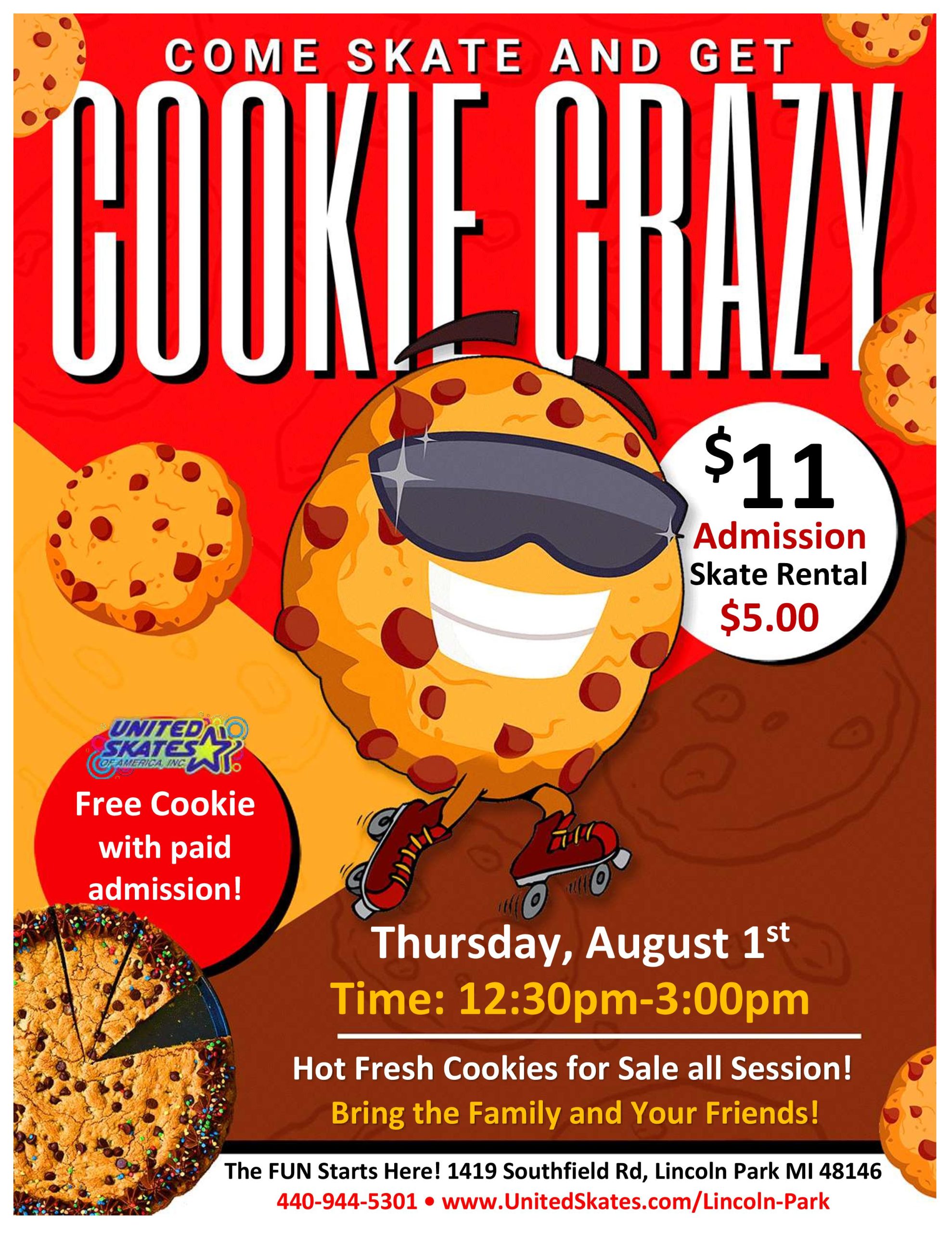 We are going Crazy for Cookies! We will be giving away cookies ALL Session Long! Thursday, August 1st 12:30pm-3:00pm Admission $10.00 Skate Rental $5.00 Bonus! Get a FREE cookie with your paid admission Booking Daycares, YMCA’s, Recs and MORE! Call Madison today 313-381-7465