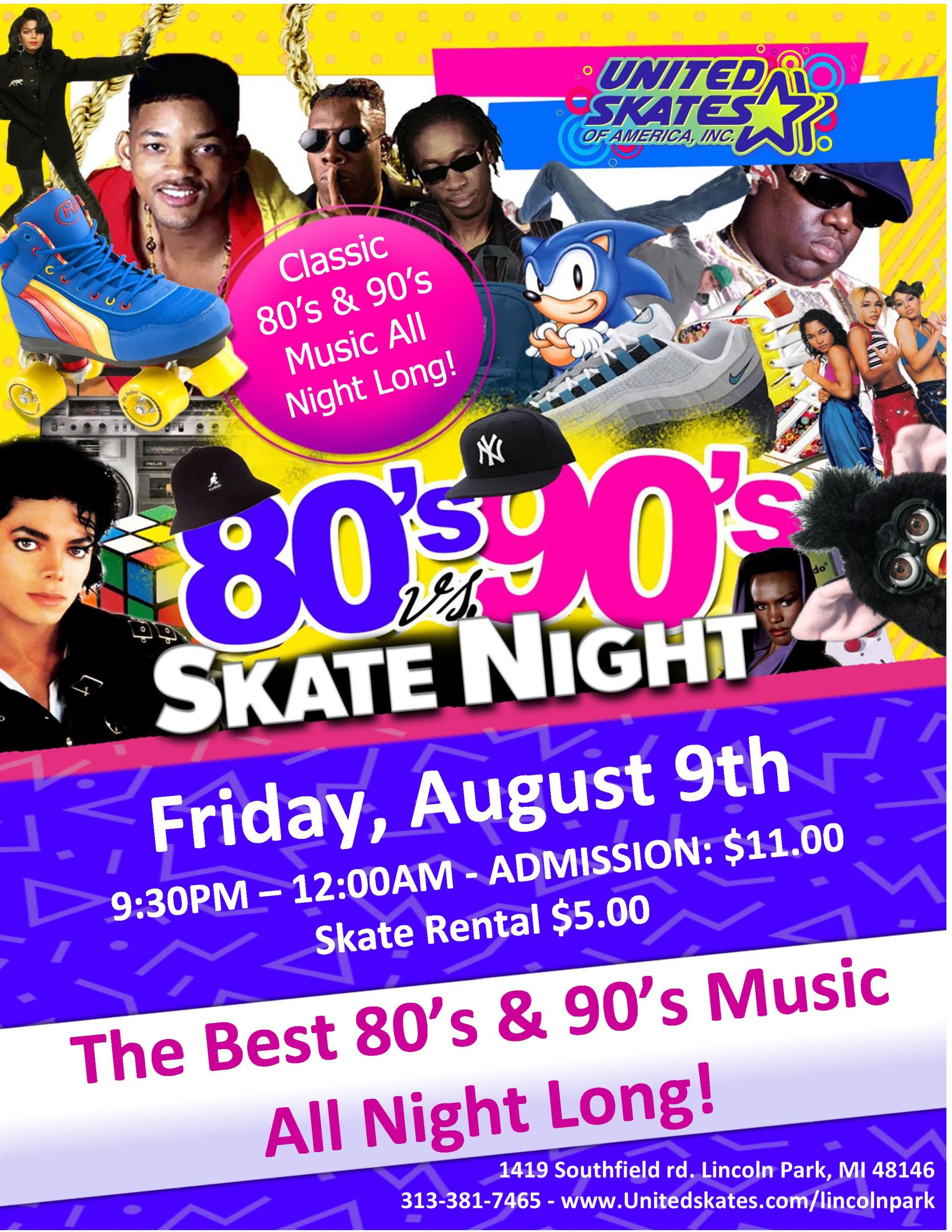 We are ready for some Old School Music! We are taking it back to the 80’s and 90’s! Which decade did you love best? We want to see! Wear your best 80’s or 90’s attire!! Friday, August 9th 9:30pm-12:00am Admission $11.00 Skate Rental $5.00 18+ with valid ID |