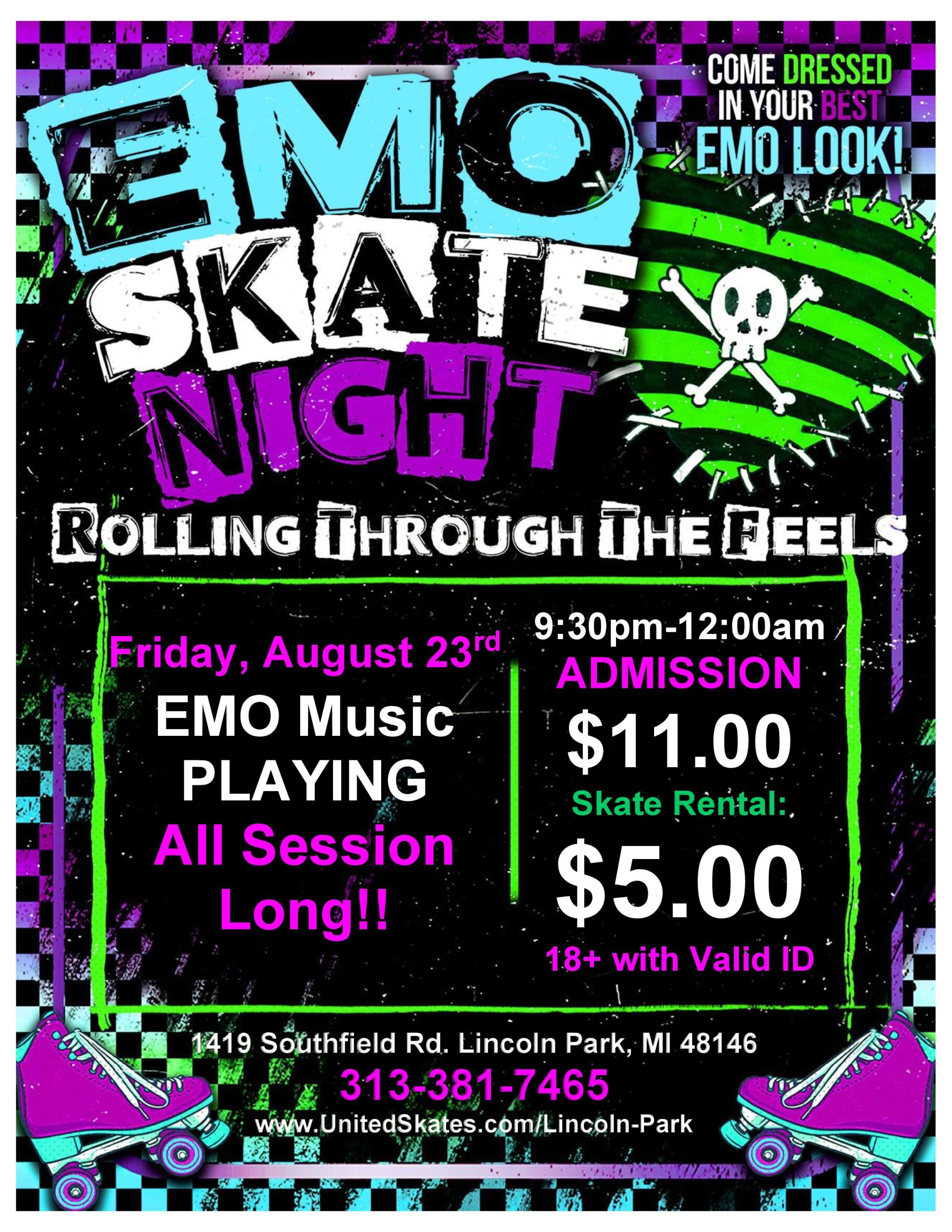 We are rocking out to the best Alternative Music! Come out and listen to Blink 182, My Chemical Romance, Green Day, Simple Plan, Paramore and MORE! Friday, August 23rd 9:30pm-12:00am Admission $11.00 Skate Rental $5.00 18+ with valid ID |