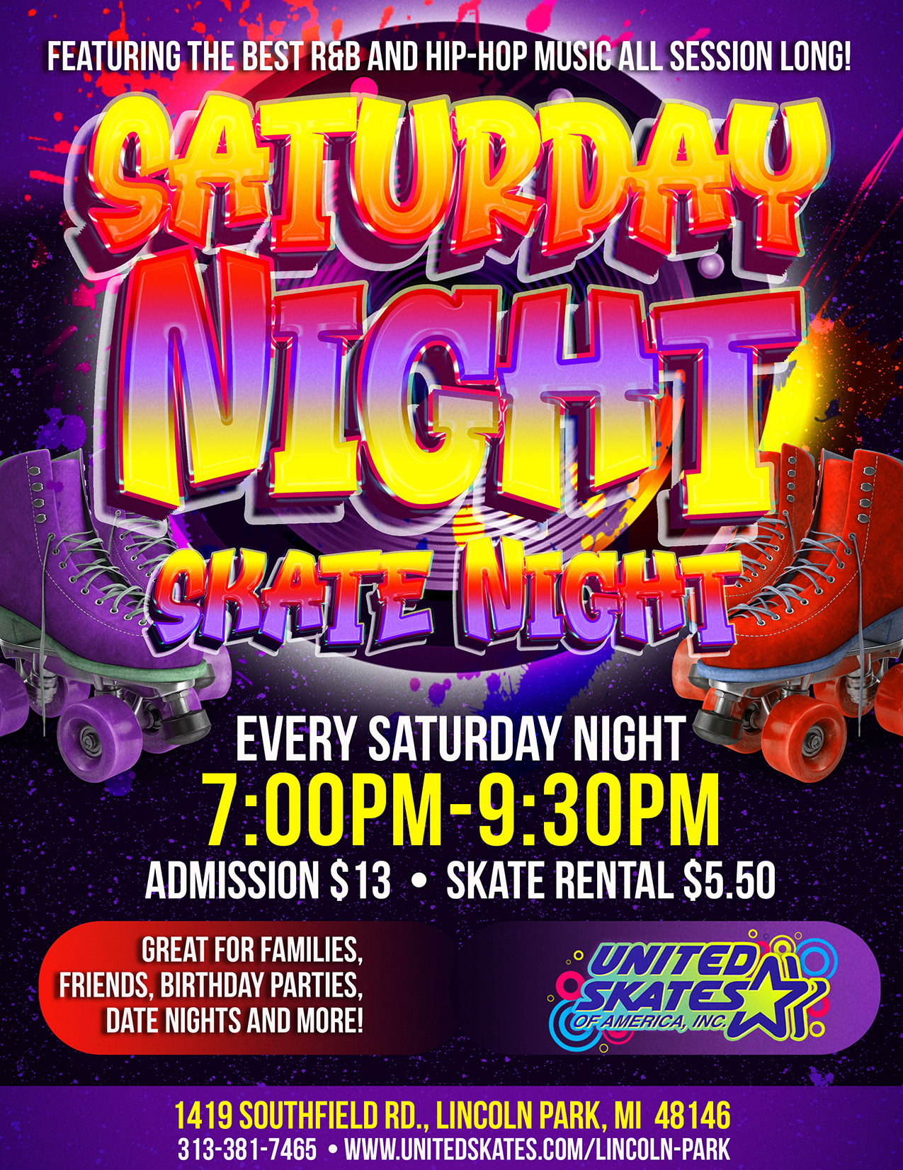 It’s Saturday Night! Come out and Skate your Saturday Away! If your family loves Hip-Hop and R&B Music this session is meant for you! Every Saturday Night 7:00pm-9:30pm Admission $13.00 Skate Rental $5.50 |