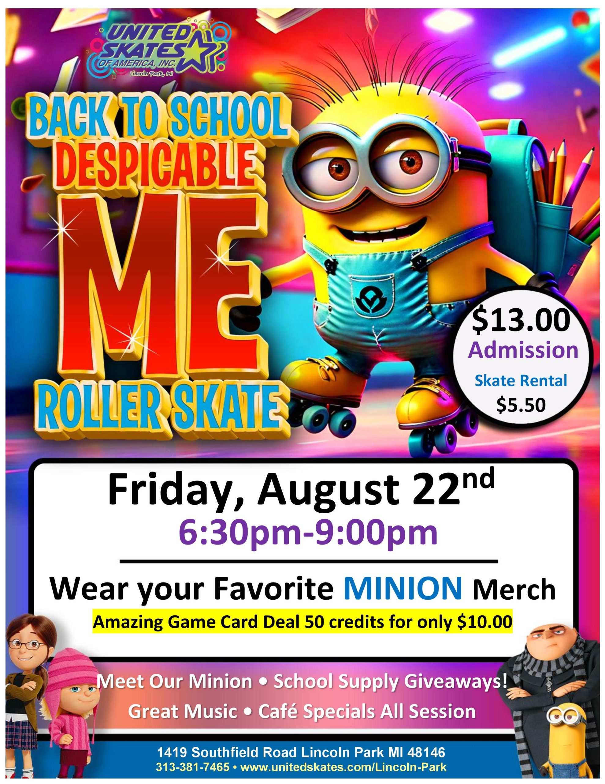 📚🛼 Back to School Skate Bash! 🛼📚Back to school season is here — but before the homework starts, let’s have one last round of fun on wheels! Join us for our Back-to-School Skate featuring our mischievous Minion, who’s rolling in with a backpack full of surprises! Friday, August 22nd 6:30pm-9:00pm Admission $13.00 Skate Rental $5.50 🎒 Giveaways all session long!✨ Win awesome […] |
